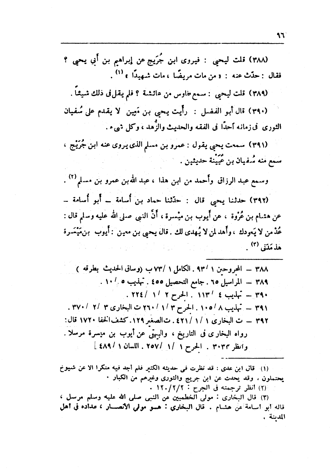 388 - قلت ليحيى فيروى بن جريج عَن إِبْرَاهِيم بن أَبى يحيى فَقَالَ حدث عَنهُ من مَاتَ مَرِيضا مَاتَ شَهِيدا