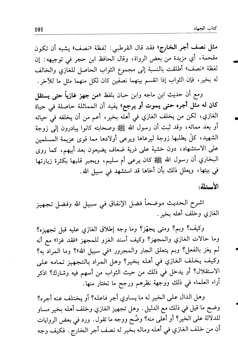 ومع أن حديث ابن ماجه وابن حبان بلفظ من جهز غازيا حتى يستقل كان له مثل أجره حتى يموت أو يرجع يفيد أن المماثلة حاصلة في حياة الغازي لكن من يخلف الغازي في أهله بخير أعم من أن يخلفه في حياته أو بعد مماته وقد ثبت أن رسول الله صلى الله عليه وسلم وصحابته كانوا يبادرون إلى زوجة الشهيد كل يطلبها زوجة ليرعاها ويرعى أولادها مما قوى عزيمة المسلمين على الاستشهاد دون خشية على ذرية ضعاف يضيعون بعد أبيهم كما روى البخاري أن رسول الله صلى الله عليه وسلم كان يرعى أم سليم ويجبر قلبها بكثرة زيارتها في بيتها ويعلل ذلك بأن أخاها قد استشهد في سبيل الله