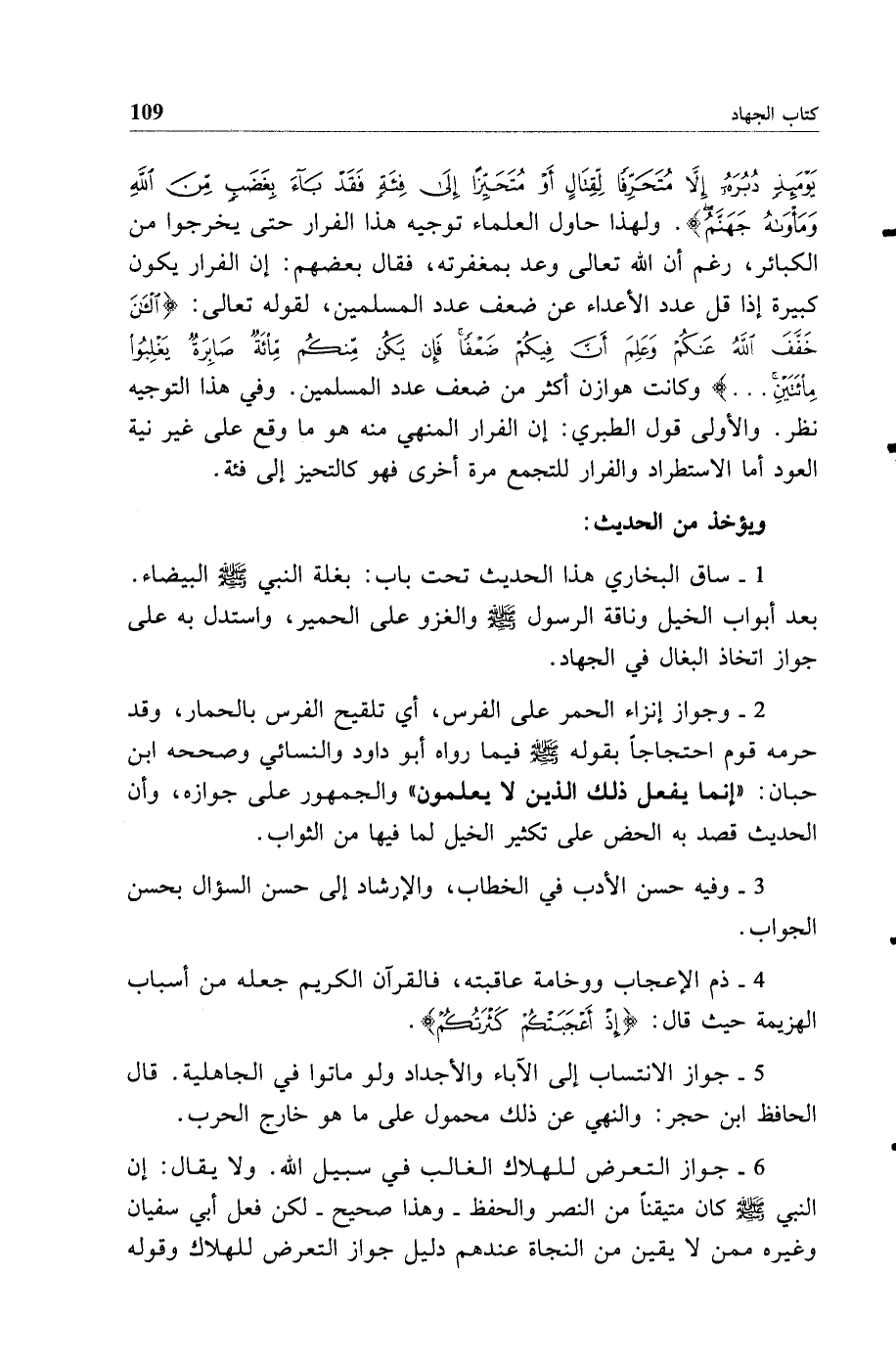 يومئذ دبره إلا متحرفا لقتال أو متحيزا إلى فئة فقد باء بغضب من الله ومأواه جهنم} ولهذا حاول العلماء توجيه هذا الفرار حتى يخرجوا من الكبائر رغم أن الله تعالى وعد بمغفرته فقال بعضهم إن الفرار يكون كبيرة إذا قل عدد الأعداء عن ضعف عدد المسلمين لقوله تعالى {الآن خفف الله عنكم وعلم أن فيكم ضعفا فإن يكن منكم مائة صابرة يغلبوا مائتين ... } وكانت هوازن أكثر من ضعف عدد المسلمين وفي هذا التوجيه نظر والأولى قول الطبري إن الفرار المنهي منه هو ما وقع على غير نية العود أما الاستطراد والفرار للتجمع مرة أخرى فهو كالتحيز إلى فئة