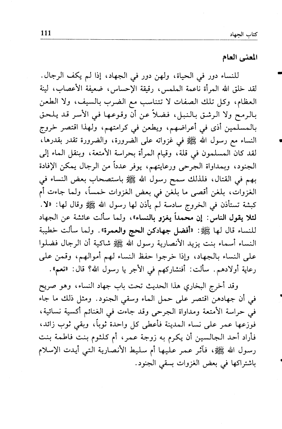 للنساء دور في الحياة ولهن دور في الجهاد إذا لم يكف الرجال لقد خلق الله المرأة ناعمة الملمس رقيقة الإحساس ضعيفة الأعصاب لينة العظام وكل تلك الصفات لا تتناسب مع الضرب بالسيف ولا الطعن بالرمح ولا الرشق بالنبل فضلا عن أن وقوعها في الأسر قد يلحق بالمسلمين أذى في أعراضهم ويطعن في كرامتهم ولهذا اقتصر خروج النساء مع رسول الله صلى الله عليه وسلم في غزواته على الضرورة والضرورة تقدر بقدرها لقد كان المسلمون في قلة وقيام المرأة بحراسة الأمتعة وبنقل الماء إلى الجنود وبمداواة الجرحى ورعايتهم يوفر عددا من الرجال يمكن الإفادة بهم في القتال فلذلك سمح رسول الله صلى الله عليه وسلم باستصحاب بعض النساء في الغزوات بلغن أقصى ما بلغن في بعض الغزوات خمسا ولما جاءت أم كبشة تستأذن في الخروج سادسة لم يأذن لها رسول الله صلى الله عليه وسلم وقال لها لا لئلا يقول الناس إن محمدا يغزو بالنساء ولما سألت عائشة عن الجهاد للنساء قال لها صلى الله عليه وسلم أفضل جهادكن الحج والعمرة ولما سألت خطيبة النساء أسماء بنت يزيد الأنصارية رسول الله صلى الله عليه وسلم شاكية أن الرجال فضلوا على النساء بالجهاد وإذا خرجوا حفظ النساء لهم أموالهم وقمن على رعاية أولادهم سألت أفنشاركهم في الأجر يا رسول الله قال نعم