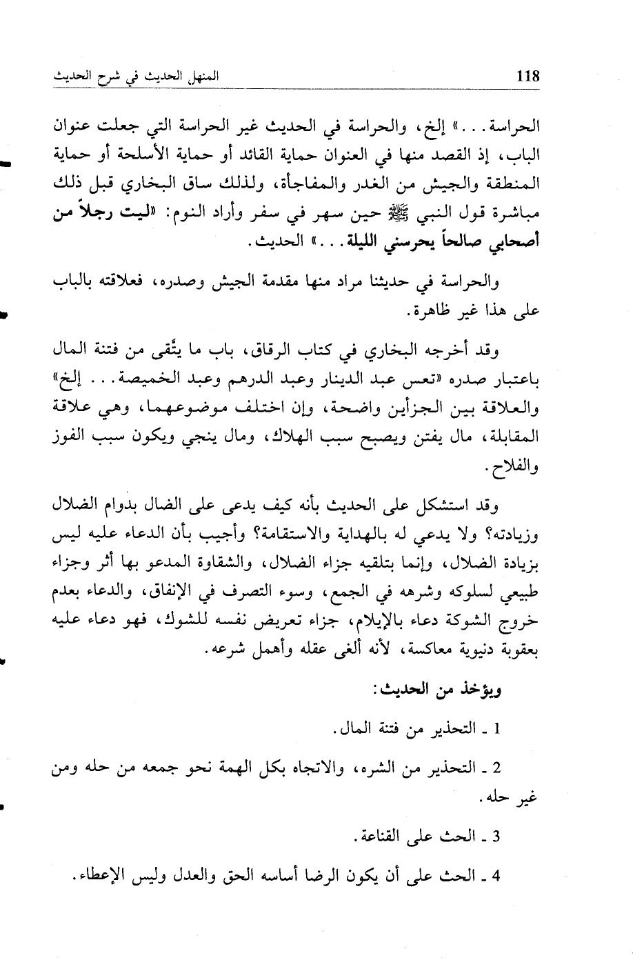 الحراسة ... إلخ والحراسة في الحديث غير الحراسة التي جعلت عنوان الباب إذ القصد منها في العنوان حماية القائد أو حماية الأسلحة أوحماية المنطقة والجيش من الغدر والمفاجأة ولذلك ساق البخاري قبل ذلك مباشرة قول النبي صلى الله عليه وسلم حين سهر في سفر وأراد النوم ليت رجلا من أصحابي صالحا يحرسني الليلة ... الحديث