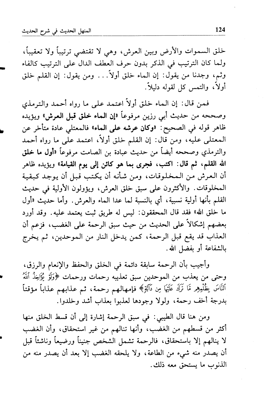 فمن قال إن الماء خلق أولا اعتمد على ما رواه أحمد والترمذي وصححه من حديث أبي رزين مرفوعا إن الماء خلق قبل العرش ويؤيده ظاهر قوله في الصحيح وكان عرشه على الماء فالمعتلي عادة متأخر عن المعتلى عليه ومن قال إن القلم خلق أولا اعتمد على ما رواه أحمد والترمذي وصححه أيضا من حديث عبادة بن الصامت مرفوعا أول ما خلق الله القلم ثم قال اكتب فجرى بما هو كائن إلى يوم القيامة ويؤيده ظاهر أن العرش من المخلوقات ومن شأنه أن يكتب قبل أن يوجد كبقية المخلوقات والأكثرون على سبق خلق العرش ويؤولون الأولية في حديث القلم بأنها أولية نسبية أي بالنسبة لما عدا الماء والعرش وأما حديث أول ما خلق الله فقد قال المحققون ليس له طريق ثبت يعتمد عليه وقد أورد بعضهم إشكالا على الحديث من حيث سبق الرحمة على الغضب فزعم أن العذاب قد يقع قبل الرحمة كمن يدخل النار من الموحدين ثم يخرج بالشفاعة أو بفضل الله