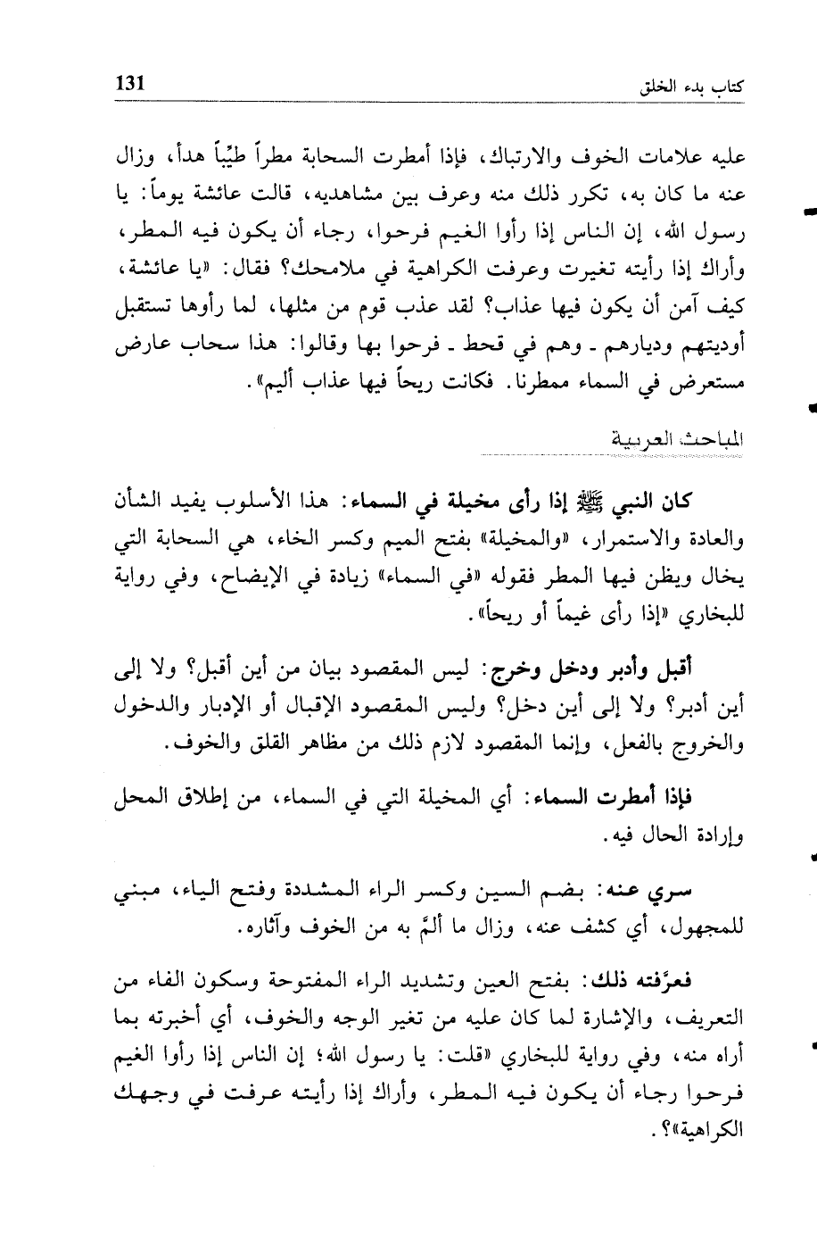 عليه علامات الخوف والارتباك فإذا أمطرت السحابة مطرا طيبا هدأ وزال عنه ما كان به تكرر ذلك منه وعرف بين مشاهديه قالت عائشة يوما يا رسول الله إن الناس إذا رأوا الغيم فرحوا رجاء أن يكون فيه المطر وأراك إذا رأيته تغيرت وعرفت الكراهية في ملامحك فقال يا عائشة كيف آمن أن يكون فيها عذاب لقد عذب قوم من مثلها لما رأوها تستقبل أوديتهم وديارهم وهم في قحط فرحوا بها وقالوا هذا سحاب عارض مستعرض في السماء ممطرنا فكانت ريحا فيها عذاب أليم