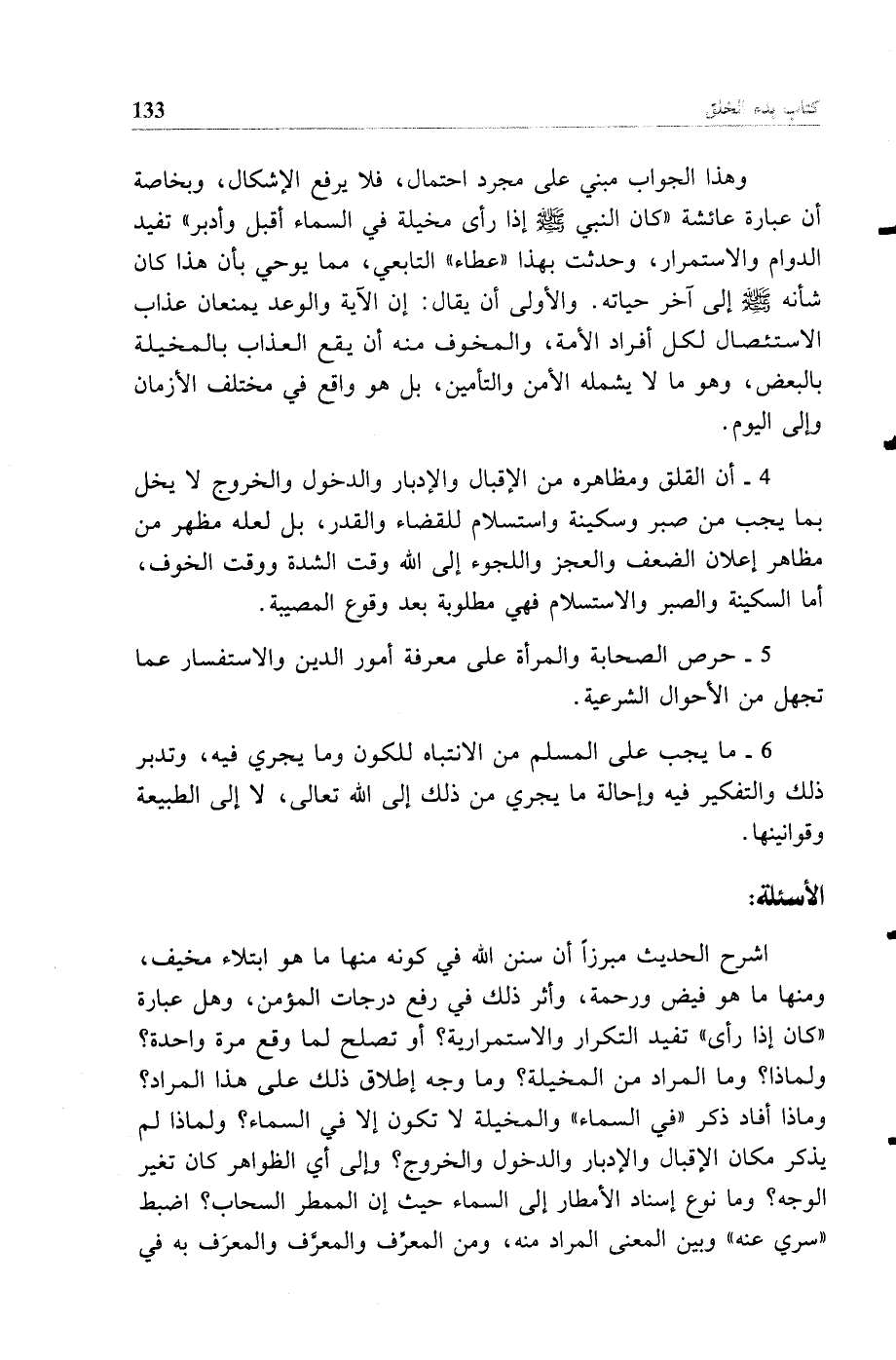 وهذا الجواب مبني على مجرد احتمال فلا يرفع الإشكال وبخاصة أن عبارة عائشة كان النبي صلى الله عليه وسلم إذا رأى مخيلة في السماء أقبل وأدبر تفيد الدوام والاستمرار وحدثت بهذا عطاء التابعي مما يوحي بأن هذا كان شأنه صلى الله عليه وسلم إلى آخر حياته والأولى أن يقال إن الآية والوعد يمنعان عذاب الاستئصال لكل أفراد الأمة والمخوف منه أن يقع العذاب بالمخيلة بالبعض وهو ما لا يشمله الأمن والتأمين بل هو واقع في مختلف الأزمان وإلى اليوم