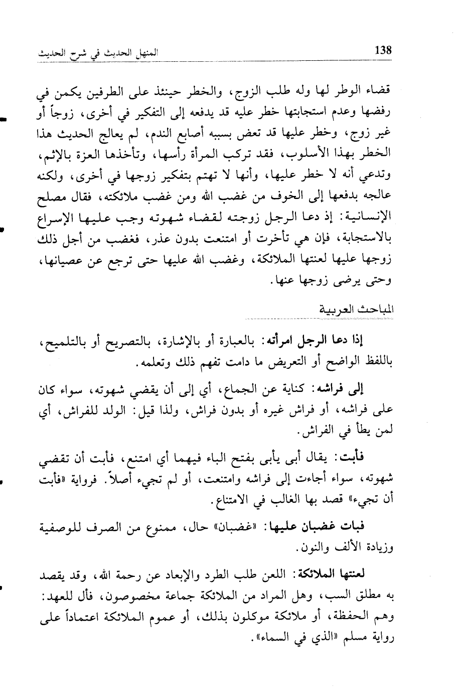 قضاء الوطر لها وله طلب الزوج والخطر حينئذ على الطرفين يكمن في رفضها وعدم استجابتها خطر عليه قد يدفعه إلى التفكير في أخرى زوجا أو غير زوج وخطر عليها قد تعض بسببه أصابع الندم لم يعالج الحديث هذا الخطر بهذا الأسلوب فقد تركب المرأة رأسها وتأخذها العزة بالإثم وتدعي أنه لا خطر عليها وأنها لا تهتم بتفكير زوجها في أخرى ولكنه عالجه بدفعها إلى الخوف من غضب الله ومن غضب ملائكته فقال مصلح الإنسانية إذ دعا الرجل زوجته لقضاء شهوته وجب عليها الإسراع بالاستجابة فإن هي تأخرت أو امتنعت بدون عذر فغضب من أجل ذلك زوجها عليها لعنتها الملائكة وغضب الله عليها حتى ترجع عن عصيانها وحتى يرضى زوجها عنها