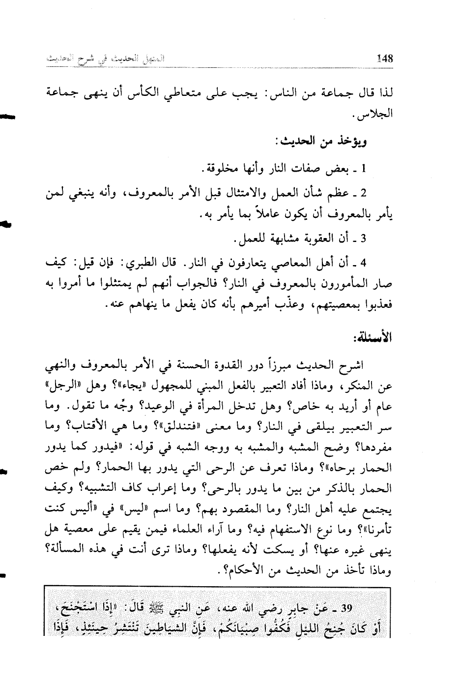 39 - عن جابر رضي الله عنه عن النبي صلى الله عليه وسلم قال: إذا استجنح أو كان جنح الليل فكفوا صبيانكم، فإن الشياطين تنتشر حينئذ فإذا