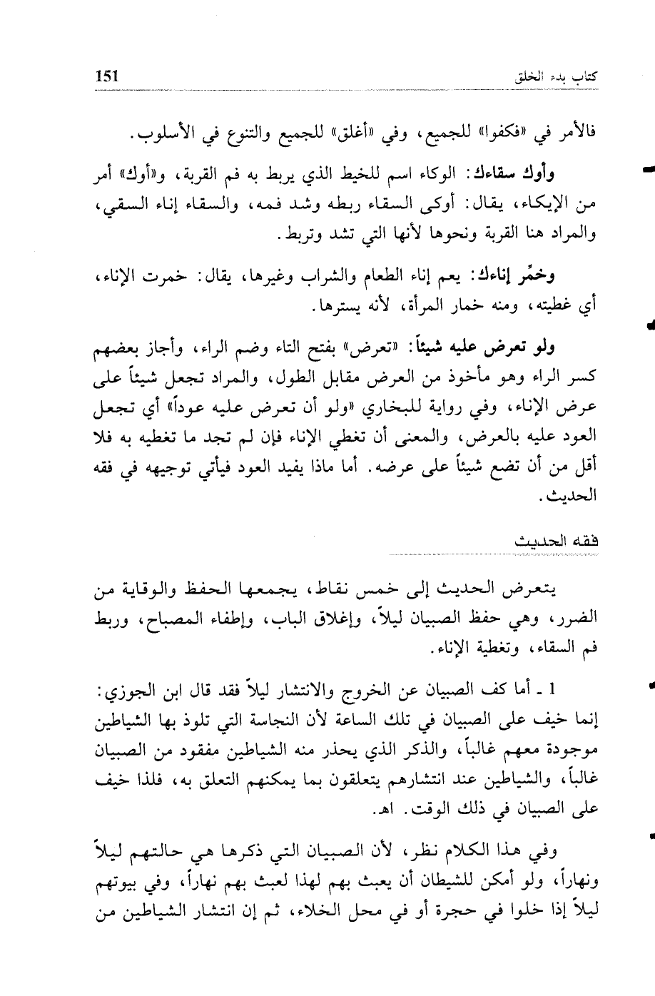 يتعرض الحديث إلى خمس نقاط يجمعها الحفظ والوقاية من الضرر وهي حفظ الصبيان ليلا وإغلاق الباب وإطفاء المصباح وربط فم السقاء وتغطية الإناء