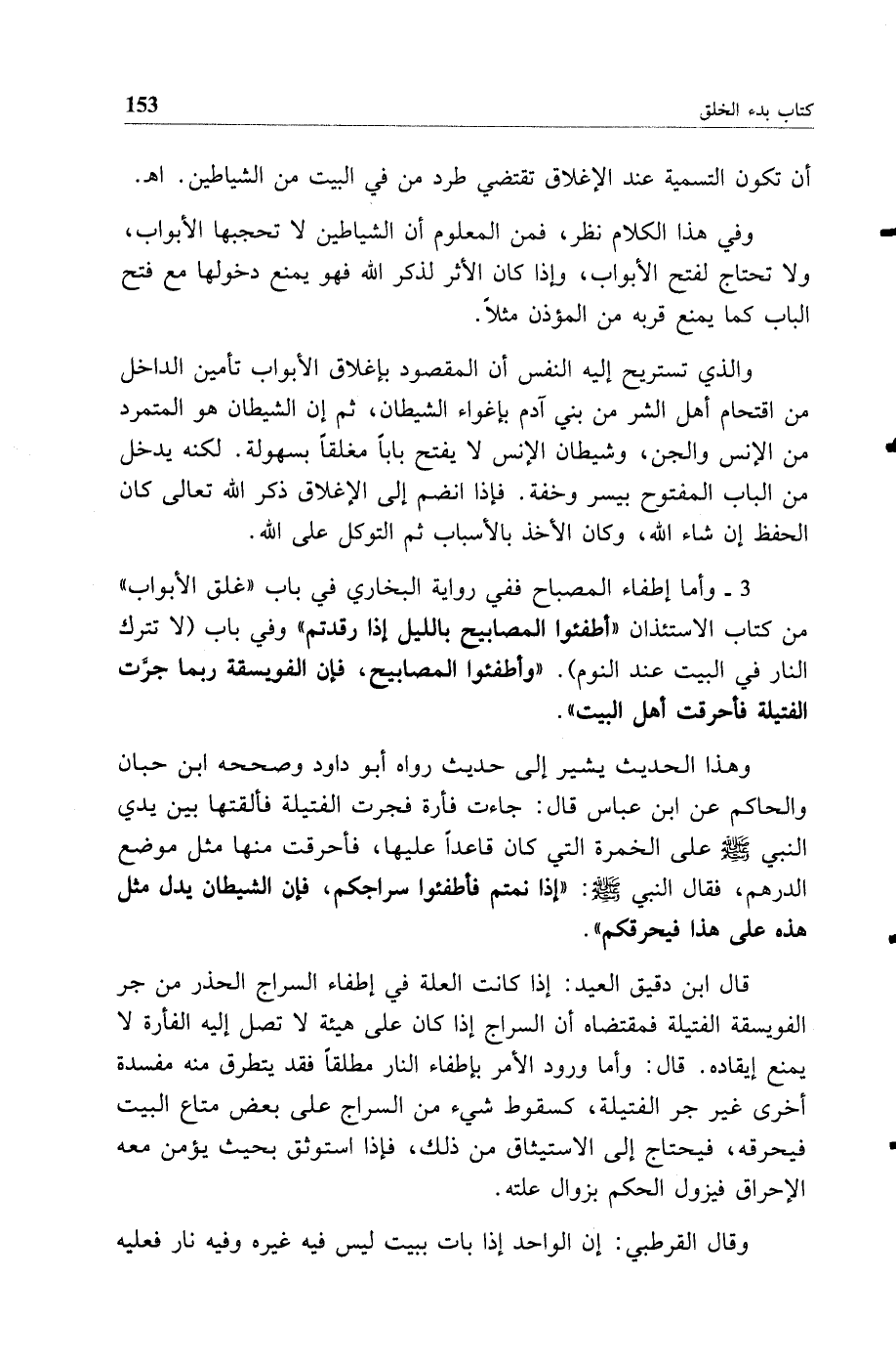 3 - وأما إطفاء المصباح ففي رواية البخاري في باب غلق الأبواب من كتاب الاستئذان أطفئوا المصابيح بالليل إذا رقدتم وفي باب (لا تترك النار في البيت عند النوم) وأطفئوا المصابيح فإن الفويسقة ربما جرت الفتيلة فأحرقت أهل البيت