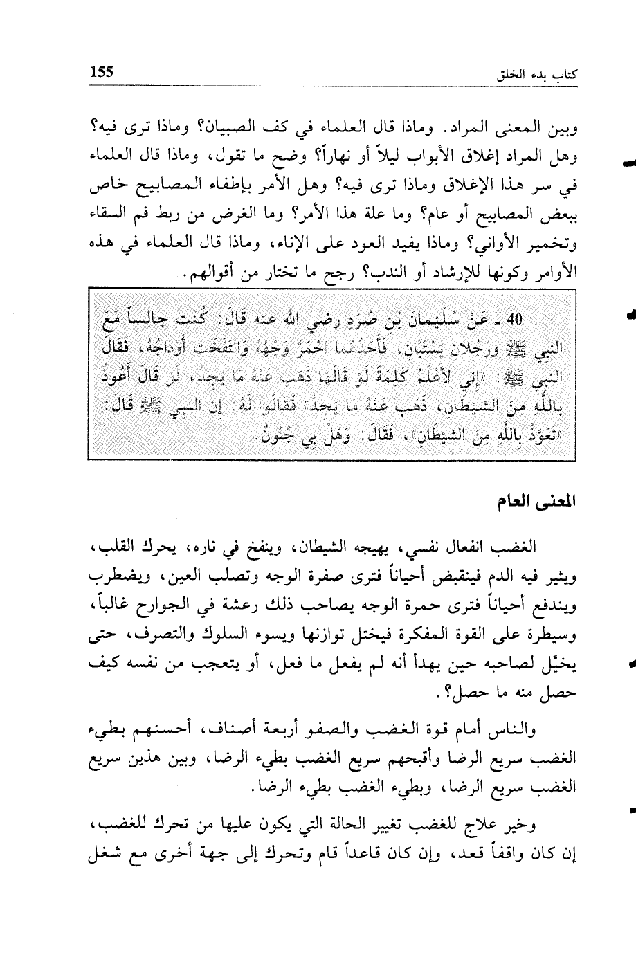 40 - عن سليمان بن صرد رضي الله عنه قال: كنت جالسا مع النبي صلى الله عليه وسلم ورجلان يستبان فأحدهما احمر وجهه وانتفخت أوداجه فقال النبي صلى الله عليه وسلم إني لأعلم كلمة لو قالها ذهب عنه ما يجد لو قال أعوذ بالله من الشيطان ذهب عنه ما يجد فقالوا له إن النبي صلى الله عليه وسلم قال تعوذ بالله من الشيطان فقال وهل بي جنون