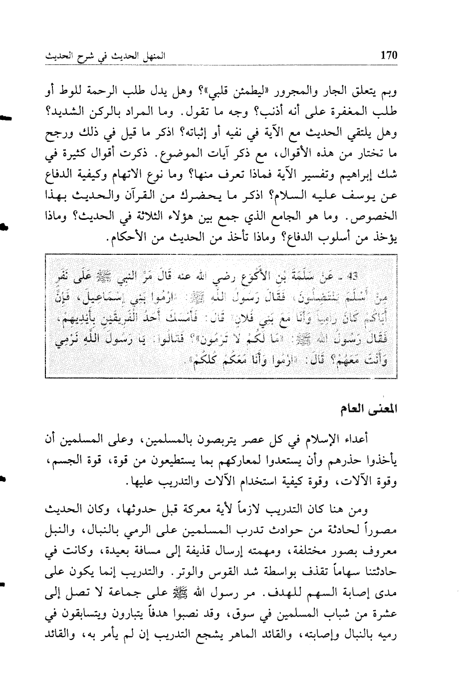 ومن هنا كان التدريب لازما لأية معركة قبل حدوثها وكان الحديث مصورا لحادثة من حوادث تدرب المسلمين على الرمي بالنبال والنبل معروف بصور مختلفة ومهمته إرسال قذيفة إلى مسافة بعيدة وكانت في حادثتنا سهاما تقذف بواسطة شد القوس والوتر والتدريب إنما يكون على مدى إصابة السهم للهدف مر رسول الله صلى الله عليه وسلم على جماعة لا تصل إلى عشرة من شباب المسلمين في سوق وقد نصبوا هدفا يتبارون ويتسابقون في رميه بالنبال وإصابته والقائد الماهر يشجع التدريب إن لم يأمر به والقائد