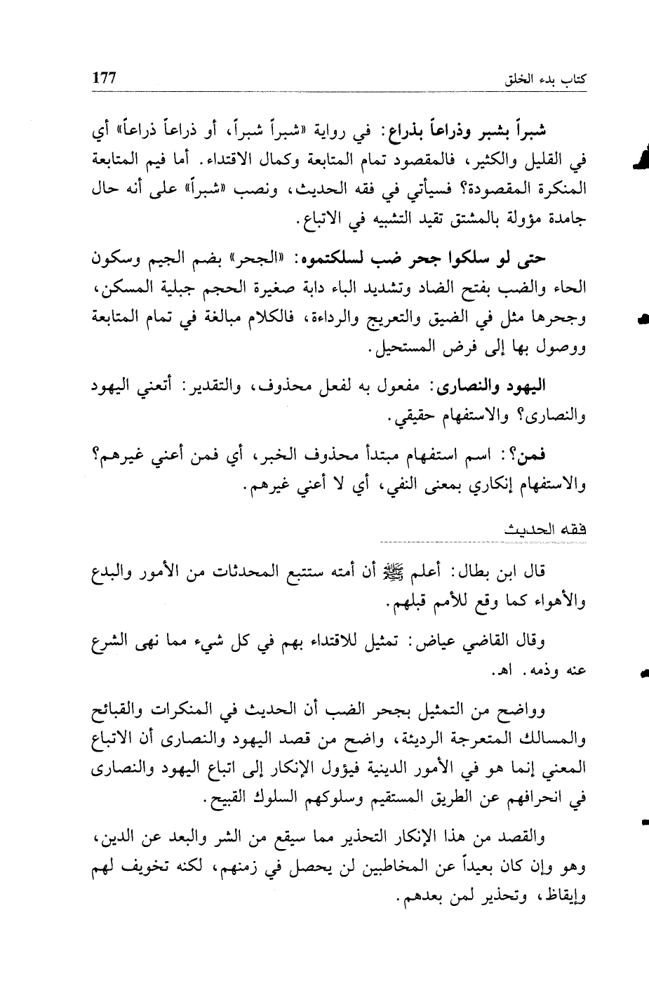 وواضح من التمثيل بجحر الضب أن الحديث في المنكرات والقبائح والمسالك المتعرجة الرديئة واضح من قصد اليهود والنصارى أن الاتباع المعني إنما هو في الأمور الدينية فيؤول الإنكار إلى اتباع اليهود والنصارى في انحرافهم عن الطريق المستقيم وسلوكهم السلوك القبيح