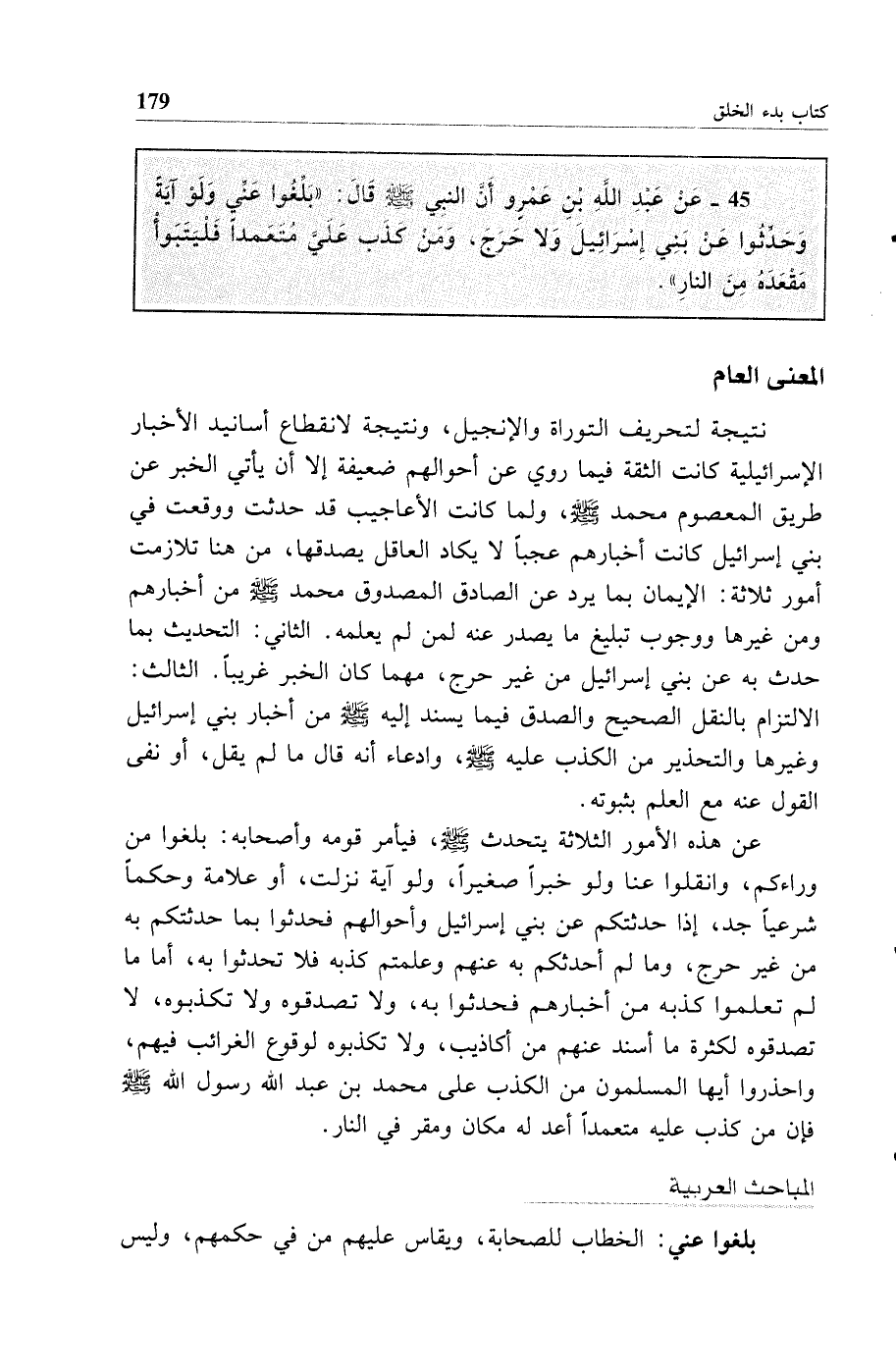 45 - عن عبد الله بن عمرو أن النبي صلى الله عليه وسلم قال بلغوا عني ولو آية وحدثوا عن بني إسرائيل ولا حرج ومن كذب علي متعمدا فليتبوأ مقعده من النار
