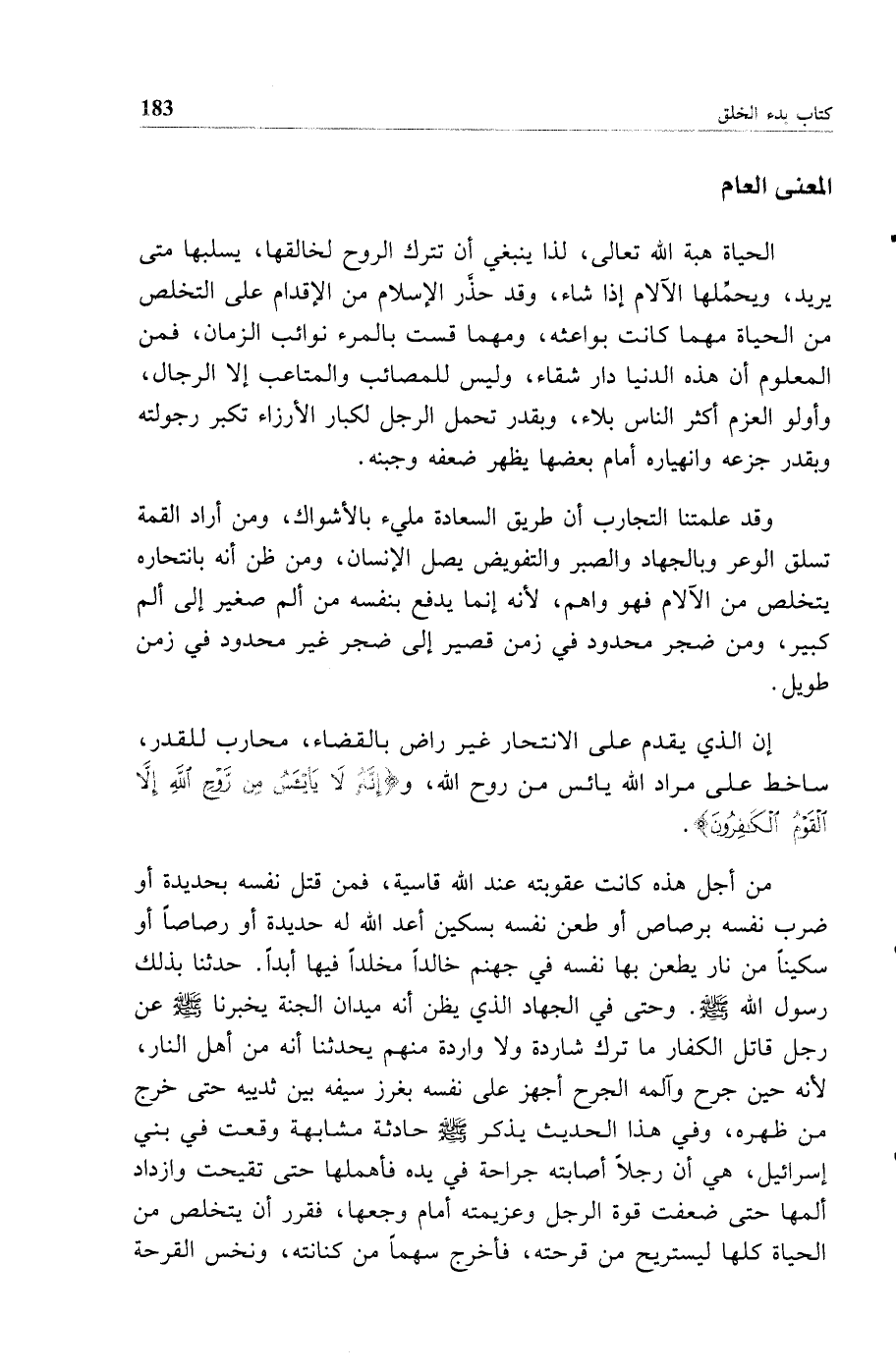 الحياة هبة الله تعالى لذا ينبغي أن تترك الروح لخالقها يسلبها متى يريد ويحملها الآلام إذا شاء وقد حذر الإسلام من الإقدام على التخلص من الحياة مهما كانت بواعثه ومهما قست بالمرء نوائب الزمان فمن المعلوم أن هذه الدنيا دار شقاء وليس للمصائب والمتاعب إلا الرجال وأولو العزم أكثر الناس بلاء وبقدر تحمل الرجل لكبار الأرزاء تكبر رجولته وبقدر جزعه وانهياره أمام بعضها يظهر ضعفه وجبنه