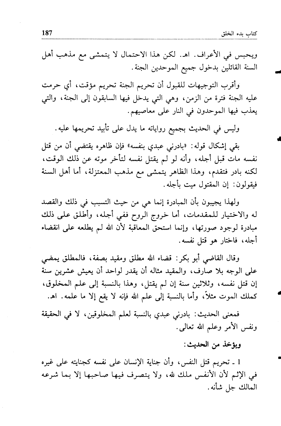 بقي إشكال قوله بادرني عبدي بنفسه فإن ظاهره يقتضي أن من قتل نفسه مات قبل أجله وأنه لو لم يقتل نفسه لتأخر موته عن ذلك الوقت لكنه بادر فتقدم وهذا الظاهر يتمشى مع مذهب المعتزلة أما أهل السنة فيقولون إن المقتول ميت بأجله