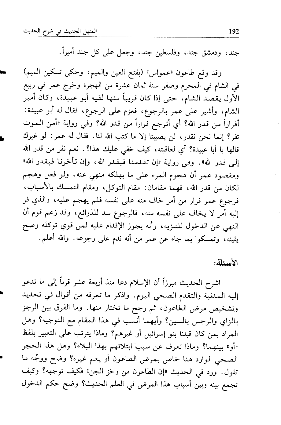وقد وقع طاعون عمواس (بفتح العين والميم وحكي تسكين الميم) في الشام في المحرم وصفر سنة ثمان عشرة من الهجرة وخرج عمر في ربيع الأول يقصد الشام حتى إذا كان قريبا منها لقيه أبو عبيدة وكان أمير الشام وأشير على عمر بالرجوع فعزم على الرجوع فقال له أبو عبيدة أفرارا من قدر الله أي أترجع فرارا من قدر الله وفي رواية أمن الموت نفر إنما نحن بقدر لن يصيبنا إلا ما كتب الله لنا فقال له عمر لو غيرك قالها يا أبا عبيد أي لعاقبته كيف خفي عليك هذا نعم نفر من قدر الله إلى قدر الله وفي رواية إن تقدمنا فبقدر الله وإن تأخرنا فبقدر الله ومقصود عمر أن هجوم المرء على ما يهلكه منهي عنه ولو فعل وهجم لكان من قدر الله فهما مقامان مقام التوكل ومقام التمسك بالأسباب فرجوع عمر فرار من أمر خاف منه على نفسه فلم يهجم عليه والذي فر إليه أمر لا يخاف على نفسه منه فالرجوع سد للذرائع وقد زعم قوم أن النهي عن الدخول للتنزيه وأنه يجوز الإقدام عليه لمن قوي توكله وصح يقينه وتمسكوا بما جاء عن عمر من أنه ندم على رجوعه والله أعلم