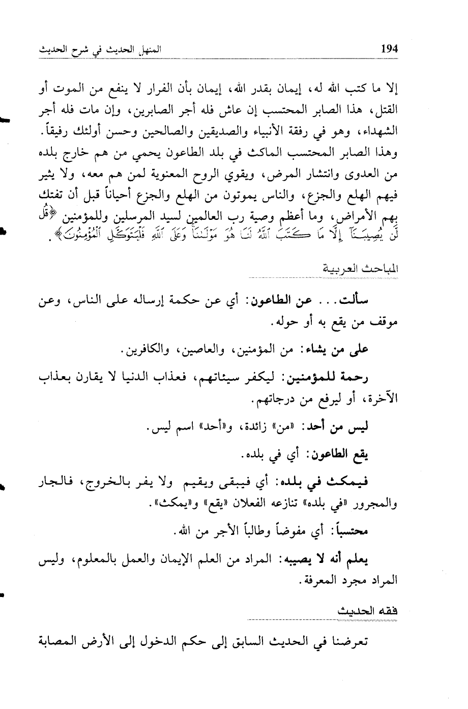 إلا ما كتب الله له إيمان بقدر الله إيمان بأن الفرار لا ينفع من الموت أو القتل هذا الصابر المحتسب إن عاش فله أجر الصابرين وإن مات فله أجر الشهداء وهو في رفقة الأنبياء والصديقين والصالحين وحسن أولئك رفيقا وهذا الصابر المحتسب الماكث في بلد الطاعون يحمي من هم خارج بلده من العدوى وانتشار المرض ويقوي الروح المعنوية لمن هم معه ولا يثير فيهم الهلع والجزع والناس يموتون من الهلع والجزع أحيانا قبل أن تفتك بهم الأمراض وما أعظم وصية رب العالمين لسيد المرسلين وللمؤمنين {قل لن يصيبنا إلا ما كتب الله لنا هو مولانا وعلى الله فليتوكل المؤمنون}