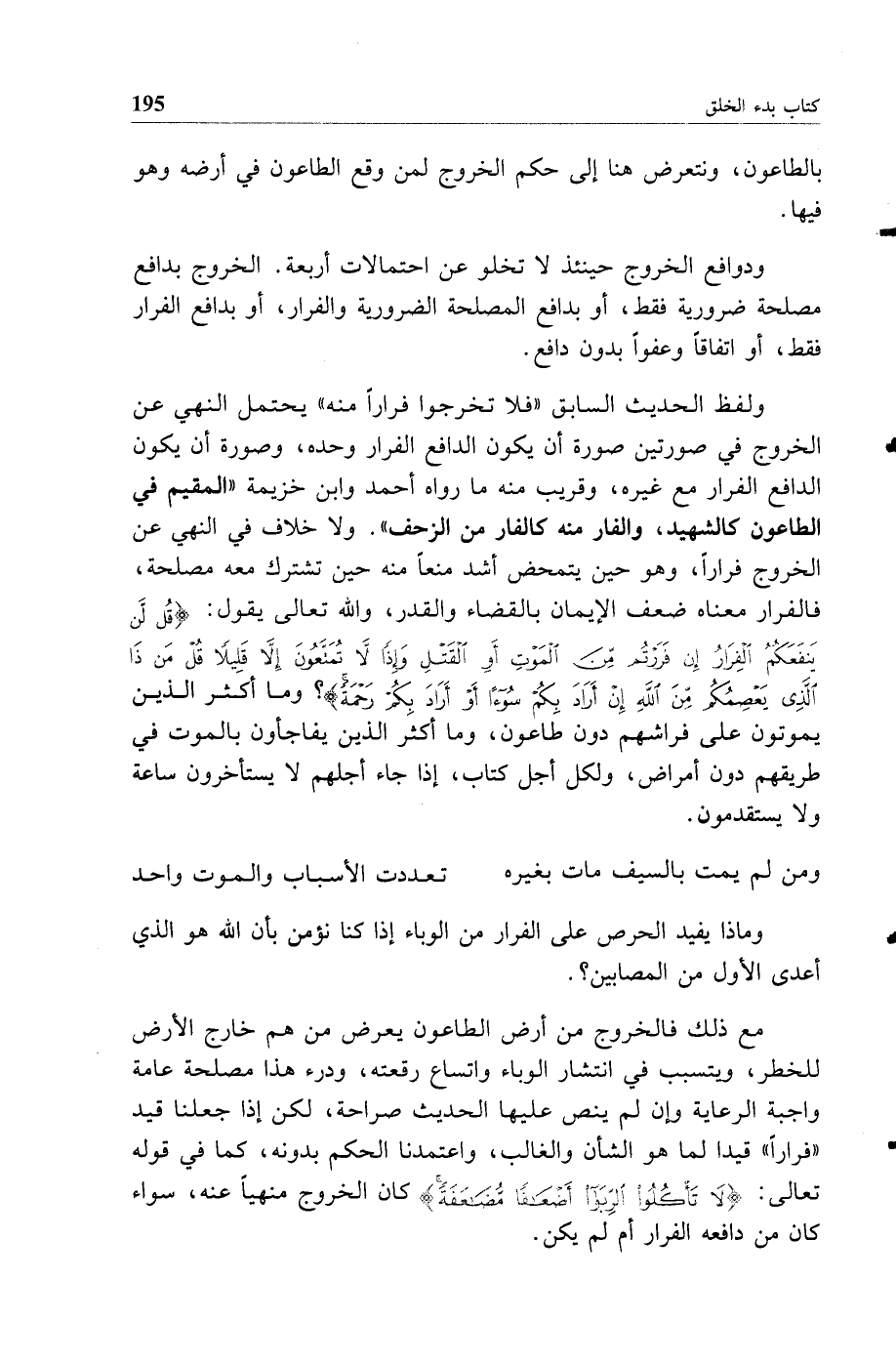 ولفظ الحديث السابق فلا تخرجوا فرارا منه يحتمل النهي عن الخروج في صورتين صورة أن يكون الدافع الفرار وحده وصورة أن يكون الدافع الفرار مع غيره وقريب منه ما رواه أحمد وابن خزيمة المقيم في الطاعون كالشهيد والفار منه كالفار من الزحف ولا خلاف في النهي عن الخروج فرارا وهو حين يتمحض أشد منعا منه حين تشترك معه مصلحة فالفرار معناه ضعف الإيمان بالقضاء والقدر والله تعالى يقول {قل لن ينفعكم الفرار إن فررتم من الموت أو القتل وإذا لا تمتعون إلا قليلا قل من ذا الذي يعصمكم من الله إن أراد بكم سوءا أو أراد بكم رحمة} وما أكثر الذين يموتون على فراشهم دون طاعون وما أكثر الذين يفاجأون بالموت في طريقهم دون أمراض ولكل أجل كتاب إذا جاء أجلهم لا يستأخرون ساعة ولا يستقدمون