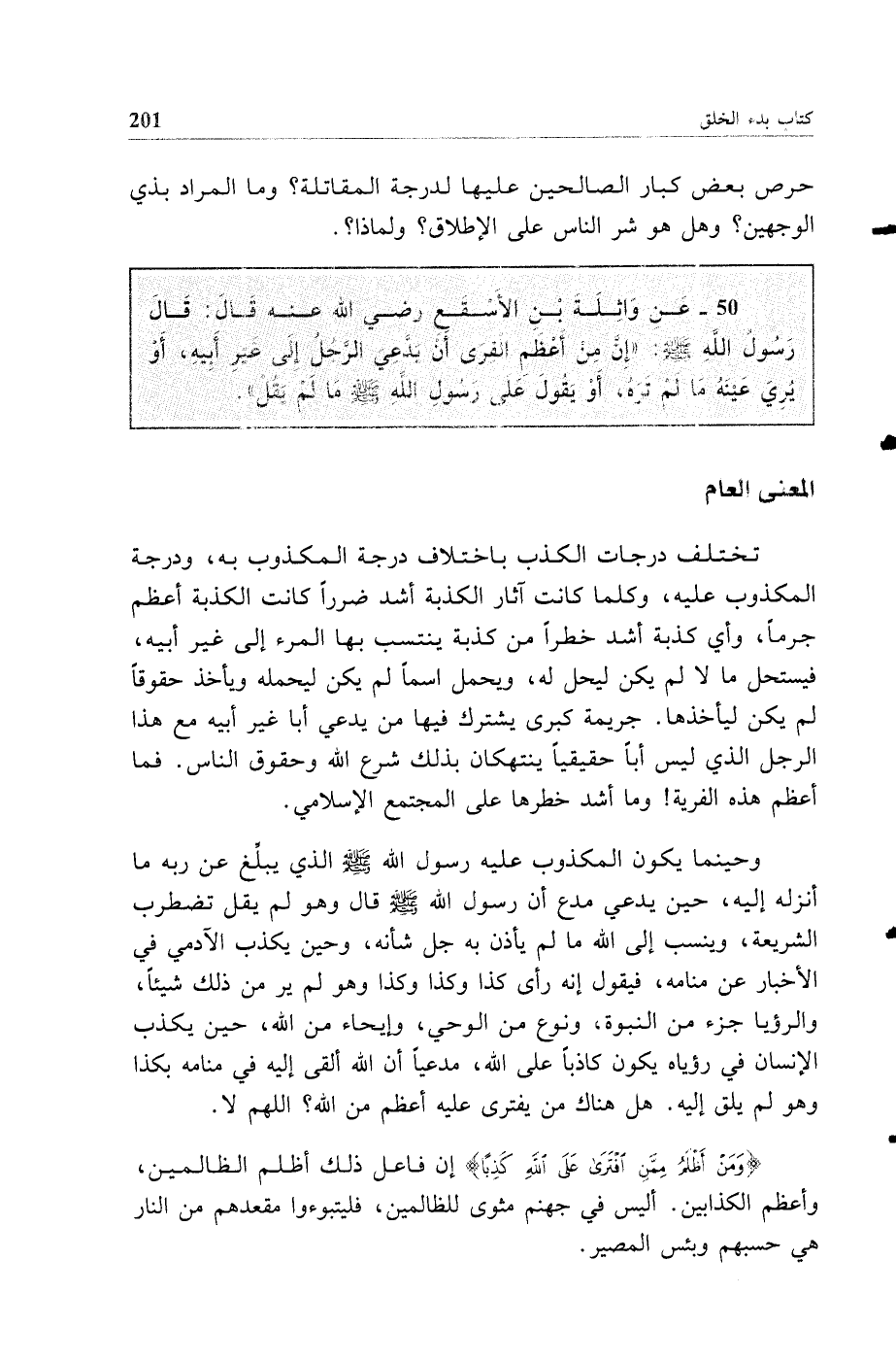 50 - عن واثلة بن الأسقع رضي الله عنه قال قال رسول الله صلى الله عليه وسلم إن من أعظم الفرى أن يدعي الرجل إلى غير أبيه أو يري عينه ما لم تره أو يقول على رسول الله صلى الله عليه وسلم ما لم يقل