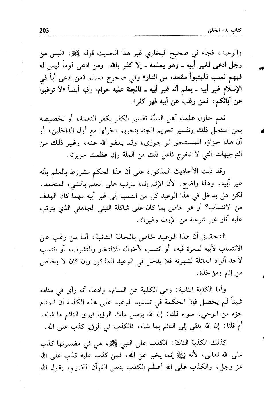والوعيد فجاء في صحيح البخاري غير هذا الحديث قوله صلى الله عليه وسلم ليس من رجل ادعى لغير أبيه وهو يعلمه إلا كفر بالله ومن ادعى قوما ليس له فيهم نسب فليتبوأ مقعده من النار وفي صحيح مسلم من ادعى أبا في الإسلام غير أبيه يعلم أنه غير أبيه فالجنة عليه حرام وفيه أيضا لا ترغبوا عن آبائكم فمن رغب عن أبيه فهو كفر