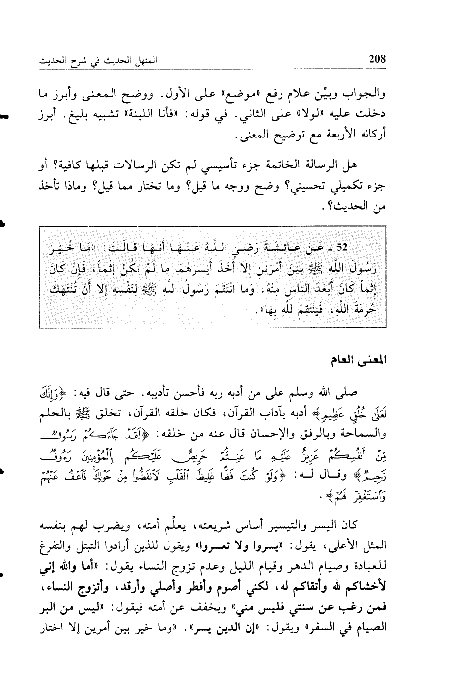52 - عن عائشة رضي الله عنها أنها قالت: ما خير رسول الله صلى الله عليه وسلم بين أمرين إلا أخذ أيسرهما ما لم يكن إثما فإن كان إثما كان أبعد الناس منه وما انتقم رسول الله صلى الله عليه وسلم لنفسه إلا أن تنتهك حرمة الله فينتقم لله بها