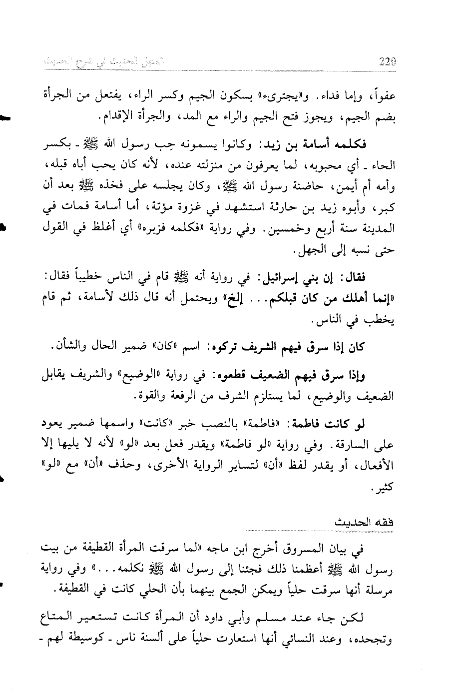 (فكلمه أسامة بن زيد) وكانوا يسمونه حب رسول الله صلى الله عليه وسلم بكسر الحاء أي محبوبه لما يعرفون من منزلته عنده لأنه كان يحب أباه قبله وأمه أم أيمن حاضنة رسول الله صلى الله عليه وسلم وكان يجلسه على فخذه صلى الله عليه وسلم بعد أن كبر وأبوه زيد بن حارثة استشهد في غزوة مؤتة أما أسامة فمات في المدينة سنة أربع وخمسين وفي رواية فكلمه فزبره أي أغلظ في القول حتى نسبه إلى الجهل
