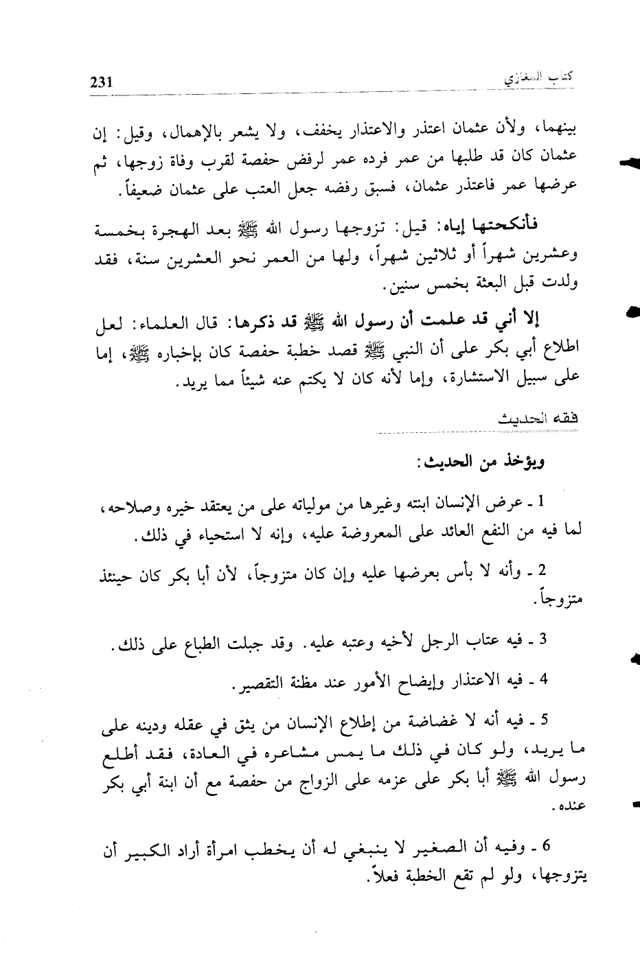 5 - فيه أنه لا غضاضة من اطلاع الإنسان من يثق في عقله ودينه على ما يريد ولو كان في ذلك ما يمس مشاعره في العادة فقد اطلع رسول الله صلى الله عليه وسلم أبا بكر على عزمه على الزواج من حفصة مع أن ابنة أبي بكر عنده