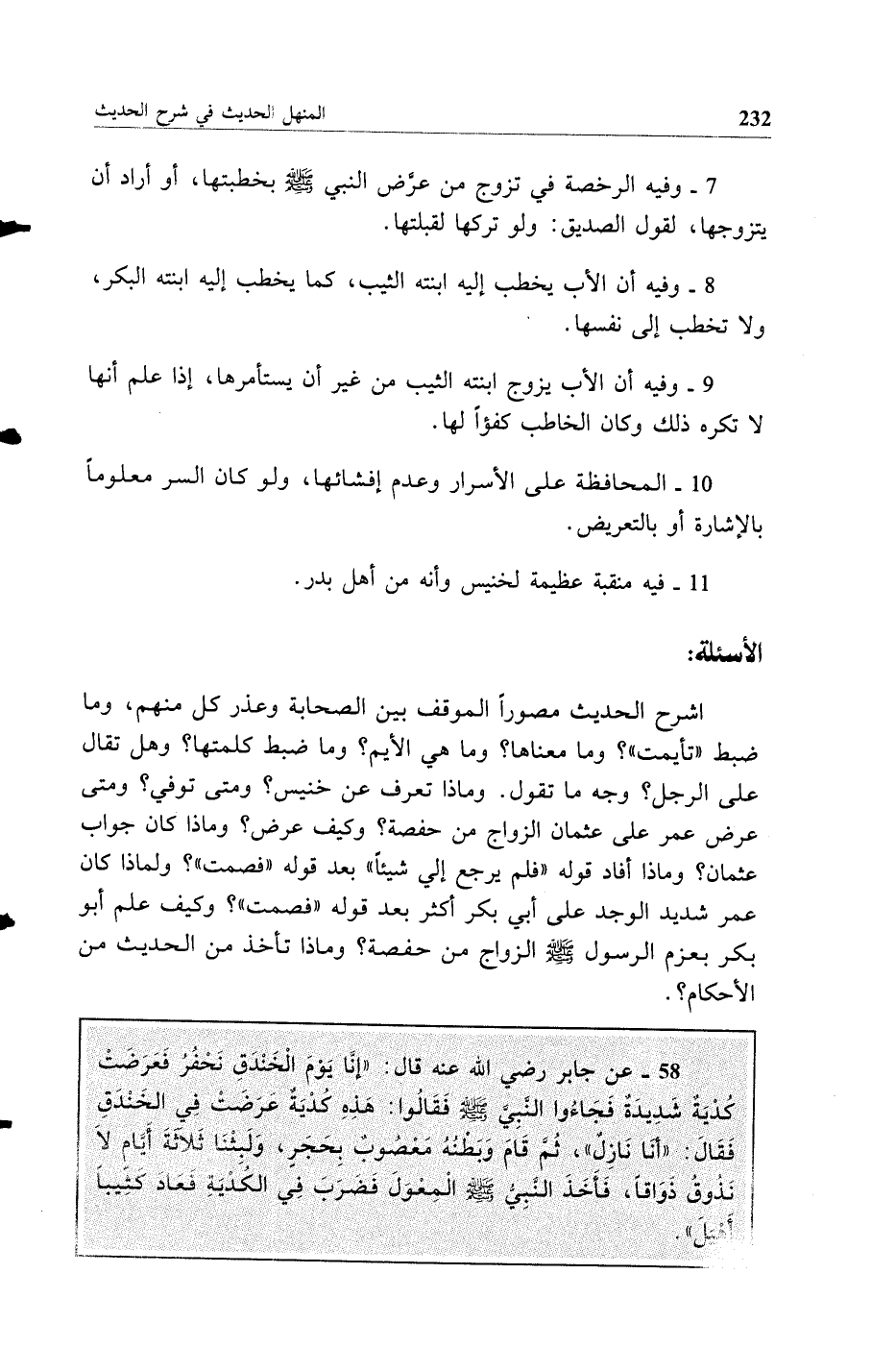 58 - عن جابر رضي الله عنه قال إنا يوم الخندق نحفر فعرضت كدية شديدة فجاءوا النبي صلى الله عليه وسلم فقالوا هذه كدية عرضت في الخندق فقال أنا نازل ثم قام وبطنه معصوب بحجر ولبثنا ثلاثة أيام لا نذوق ذواقا فأخذ النبي صلى الله عليه وسلم المعول فضرب في الكدية فعاد كثيبا أهيل