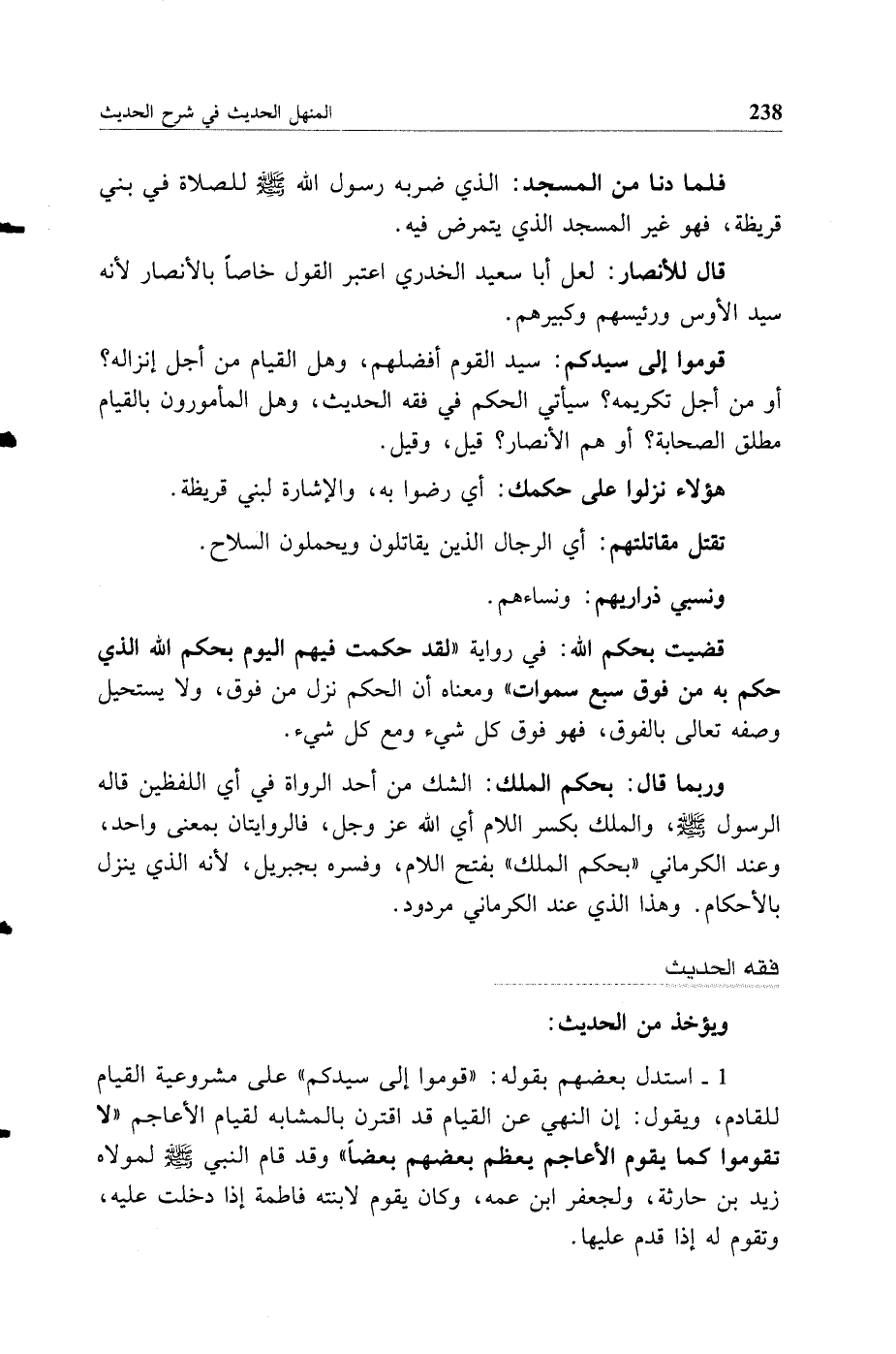 (قوموا إلى سيدكم) سيد القوم أفضلهم وهل القيام من أجل إنزاله أو من أجل تكريمه سيأتي الحكم في فقه الحديث وهل المأمورون بالقيام مطلق الصحابة أو هم الأنصار قيل وقيل