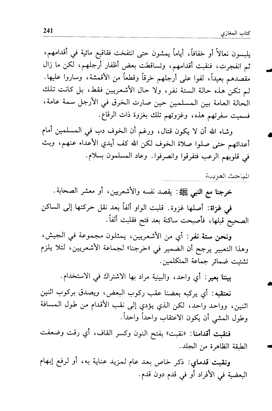يلبسون نعالا أو خفافا أياما يمشون حتى انتفخت فقاقيع مائية في أقدامهم ثم انفجرت فنقبت أقدامهم وتساقطت بعض أظفار أرجلهم لكن ما زال مقصدهم بعيدا لفوا على أرجلهم خرقا وقطعا من الأقمشة وساروا عليها لم تكن هذه حالة الستة نفر ولا حال الأشعريين فقط بل كانت تلك الحالة العامة بين المسلمين حين صارت الخرق في الأرجل سمة عامة فسميت سفرتهم هذه وغزوتهم تلك بغزوة ذات الرقاع