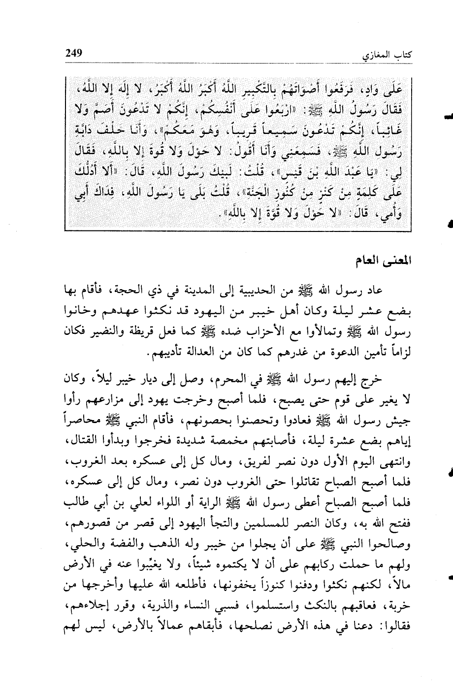 على واد فرفعوا أصواتهم بالتكبير الله أكبر الله أكبر لا إله إلا الله فقال رسول الله صلى الله عليه وسلم اربعوا على أنفسكم إنكم لا تدعون أصم ولا غائبا إنكم تدعون سميعا قريبا وهو معكم وأنا خلف دابة رسول الله صلى الله عليه وسلم فسمعني وأنا أقول لا حول ولا قوة إلا بالله فقال لي يا عبد الله بن قيس قلت لبيك رسول الله قال ألا أدلك على كلمة من كنز من كنوز الجنة قلت بلى يا رسول الله فداك أبي وأمي قال لا حول ولا قوة إلا بالله