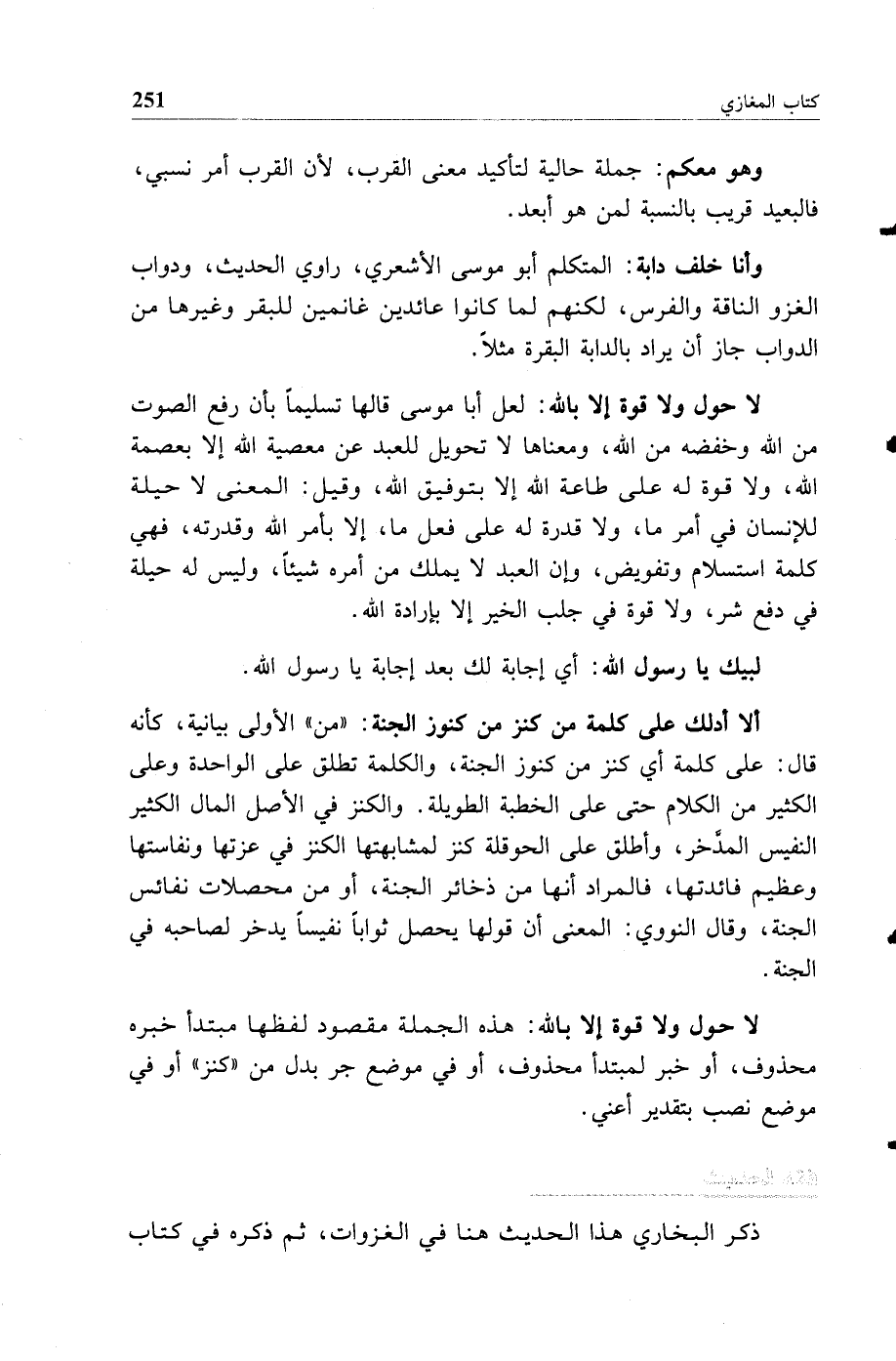 (لا حول ولا قوة إلا بالله) لعل أبا موسى قالها تسليما بأن رفع الصوت من الله وخفضه من الله ومعناها لا تحويل للعبد عن معصية الله إلا بعصمة الله ولا قوة له على طاعة الله إلا بتوفيق الله وقيل المعنى لا حيلة للإنسان في أمر ما ولا قدرة له على فعل ما إلا بأمر الله وقدرته فهي كلمة استسلام وتفويض وإن العبد لا يملك من أمره شيئا وليس له حيلة في دفع شر ولا قوة في جلب الخير إلا بإرادة الله