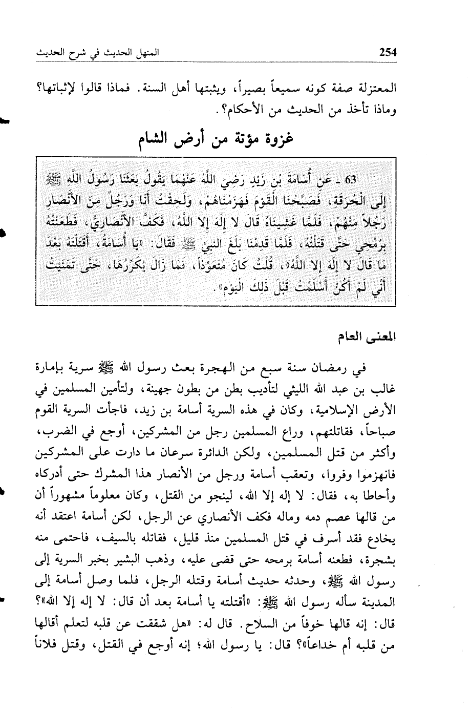 63 - عن أسامة بن زيد رضي الله عنهما يقول بعثنا رسول الله صلى الله عليه وسلم إلى الحرقة فصبحنا القوم فهزمناهم ولحقت أنا ورجل من الأنصار رجلا منهم فلما غشيناه قال لا إله إلا الله فكف الأنصاري فطعنته برمحي حتى قتلته فلما قدمنا بلغ النبي صلى الله عليه وسلم فقال يا أسامة أقتلته بعد ما قال لا إله إلا الله قلت كان متعوذا فما زال يكررها حتى تمنيت أني لم أكن أسلمت قبل ذلك اليوم