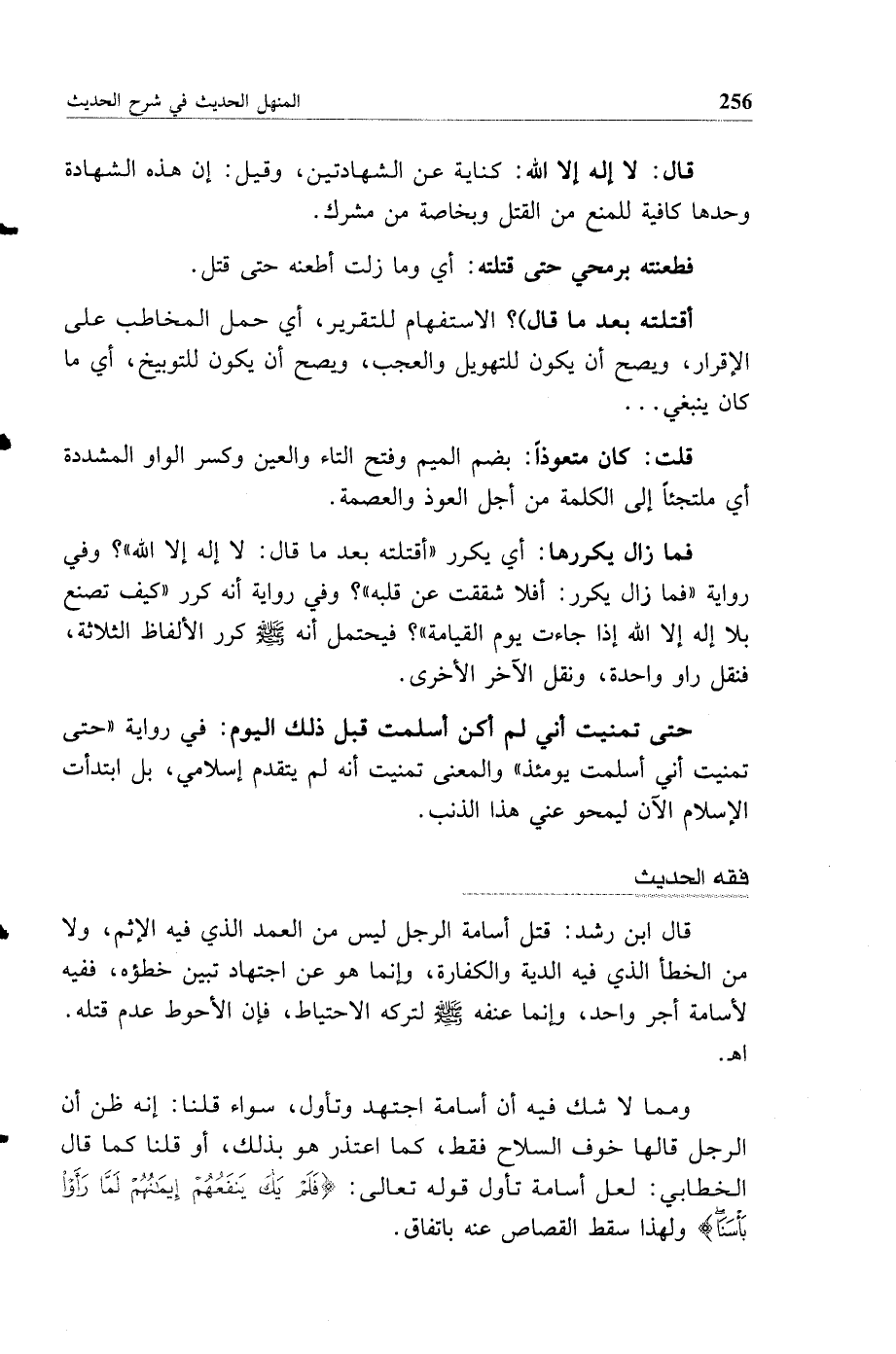 قال ابن رشد: قتل أسامة الرجل ليس من العمد الذي فيه الإثم ولا من الخطأ الذي فيه الدية والكفارة وإنما هو عن اجتهاد تبين خطؤه ففيه لأسامة أجر واحد وإنما عنفه صلى الله عليه وسلم لتركه الاحتياط فإن الأحوط عدم قتله أهـ
