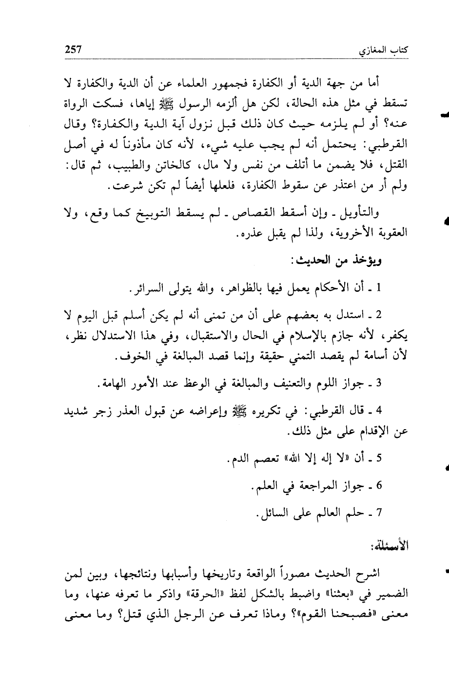 أما من جهة الدية أو الكفارة فجمهور العلماء عن أن الدية والكفارة لا تسقط في مثل هذه الحالة لكن هل ألزمه الرسول صلى الله عليه وسلم إياها فسكت الرواة عنه أو لم يلزمه حيث كان ذلك قبل نزول آية الدية والكفارة وقال القرطبي يحتمل أنه لم يجب عليه شيء لأنه كان مأذونا له في أصل القتل فلا يضمن ما أتلف من نفس ولا مال كالخاتن والطبيب ثم قال ولم أر من اعتذر عن سقوط الكفارة فلعلها أيضا لم تكن شرعت