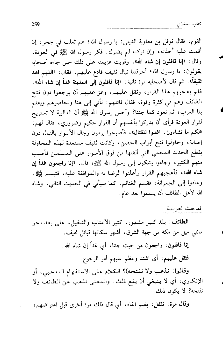القوم فقال نوفل بن معاوية الديلي يا رسول الله هم ثعلب في جحر إن أقمت عليه أخذته وإن تركته لم يضرك فكر رسول الله صلى الله عليه وسلم في العودة وقال إنا قافلون إن شاء الله وقويت عزيمته على ذلك حين جاءه أصحابه يقولون يا رسول الله أحرقتنا نبال ثقيف فادع عليهم فقال اللهم اهد ثقيفا ثم قال لأصحابه مرة ثانية إنا قافلون إلى المدينة غدا إن شاء الله فلم يعجبهم هذا القرار وثقل عليهم وعز عليهم أن يرجعوا دون فتح الطائف وهم في كثرة وقوة فقال قائلهم نأتي إلى هنا ونحاصرهم ويعلم بنا العرب ثم نعود كما جئنا وأحس رسول الله صلى الله عليه وسلم أن الغالبية لا تستريح لقرار العودة فرأى أن يدركوا بأنفسهم أن القرار حكيم وضروري فقال لهم لكم ما تشاءون اغدوا للقتال فأصبحوا يرمون رجال الأسوار بالنبال دون إصابة وحاولوا فتح أبواب الحصن وكانت ثقيف مستعدة لهذه المحاولة بقطع الحديد المحمي التي ألقتها من فوق الأسوار على المسلمين فأصيب منهم الكثير وجاءوا يشكون إلى رسول الله صلى الله عليه وسلم قال إنا راجعون غدا إن شاء الله فأعجبهم القرار وأعلنوا الرضا
