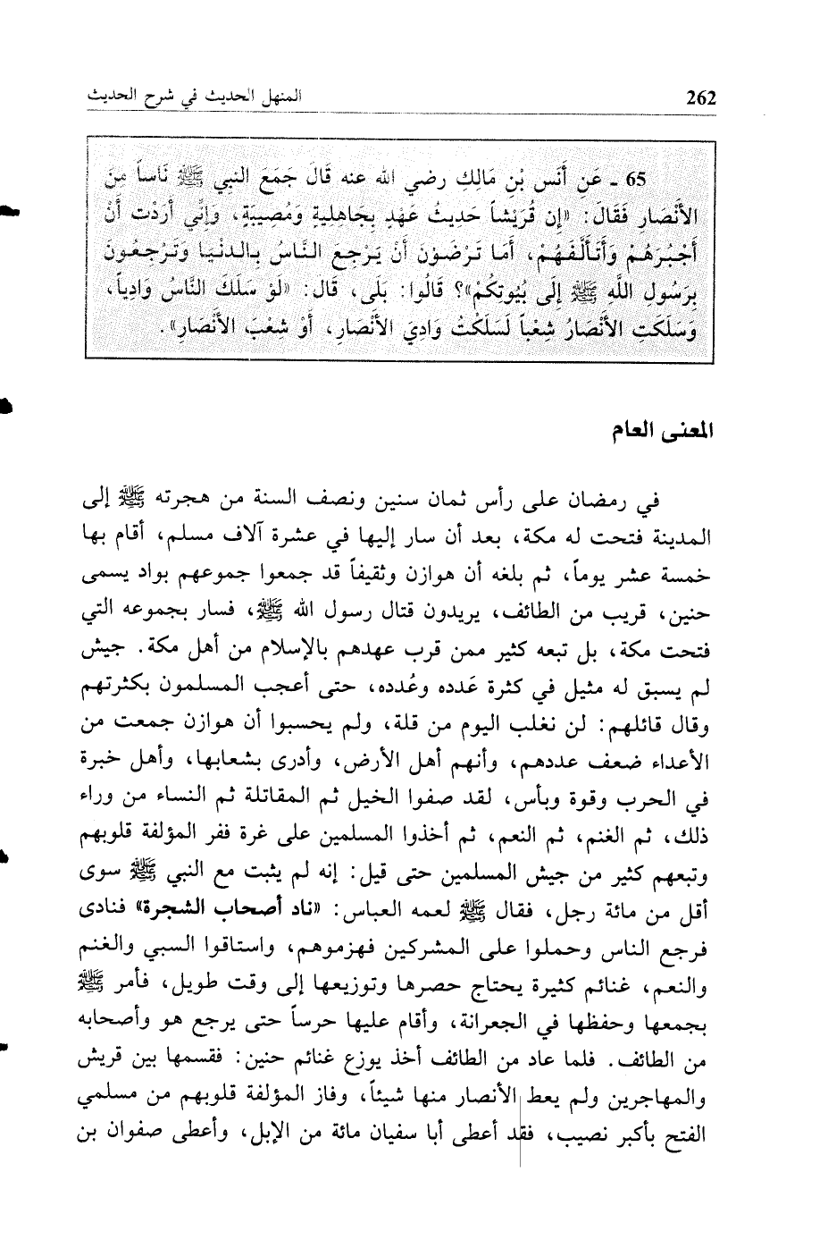 65 - عن أنس بن مالك رضي الله عنه قال جمع النبي صلى الله عليه وسلم ناسا من الأنصار فقال إن قريشا حديث عهد بجاهلية ومصيبة وإني أردت أن أجبرهم وأتألفهم أما ترضون أن يرجع الناس بالدنيا وترجعون برسول الله صلى الله عليه وسلم إلى بيوتكم قالوا بلى قال لو سلك الناس واديا وسلكت الأنصار شعبا لسلكت وادي الأنصار أو شعب الأنصار