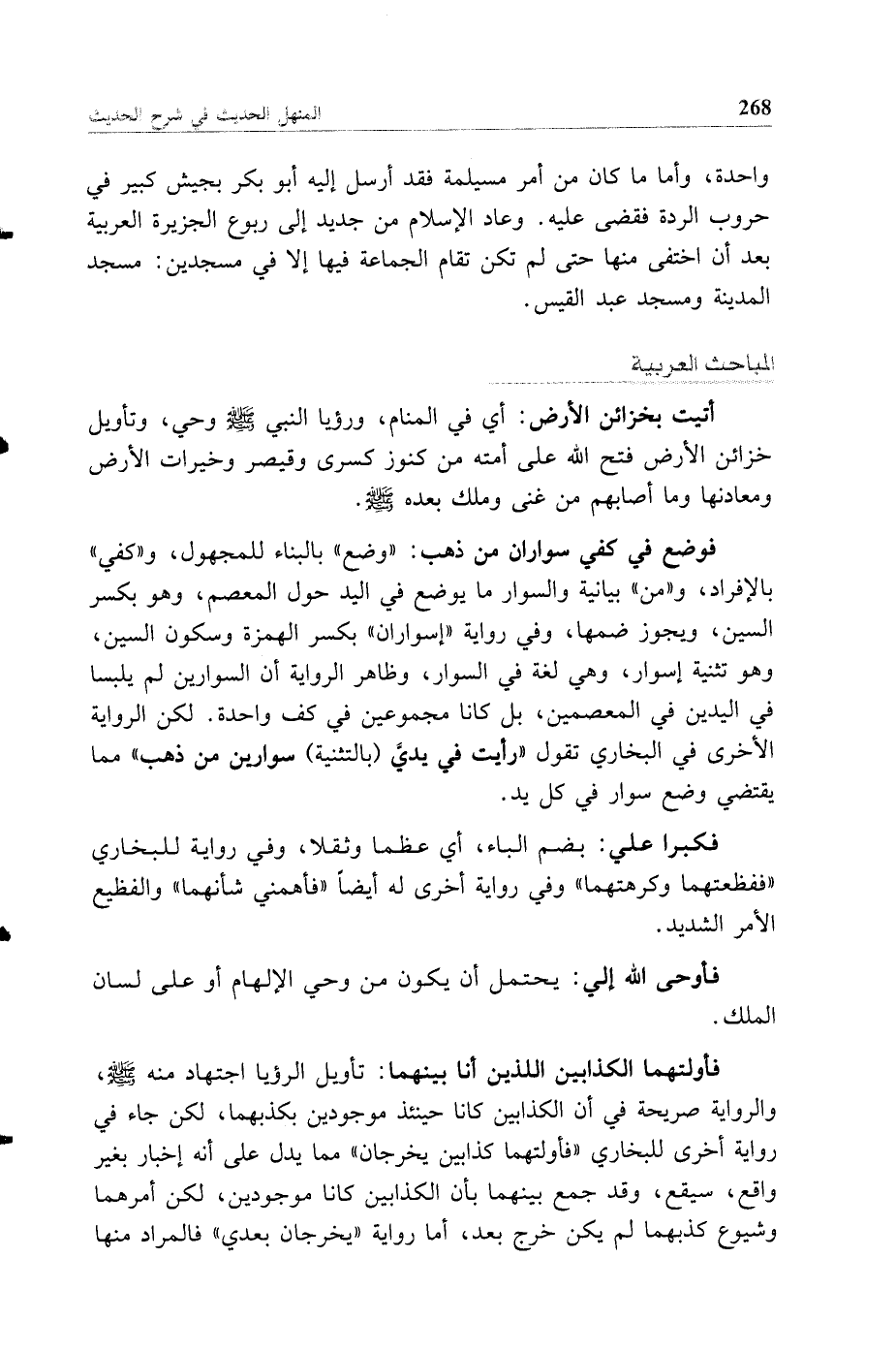(فأولتهما الكذابين اللذين أنا بينهما) تأويل الرؤيا اجتهاد منه صلى الله عليه وسلم والرواية صريحة في أن الكذابين كانا حينئذ موجودين بكذبهما لكن جاء في رواية أخرى للبخاري فأولتهما كذابين يخرجان مما يدل على أنه إخبار بغير واقع سيقع وقد جمع بينهما بأن الكذابين كانا موجودين لكن أمرهما وشيوع كذبهما لم يكن خرج بعد أما رواية يخرجان بعدي فالمراد منها