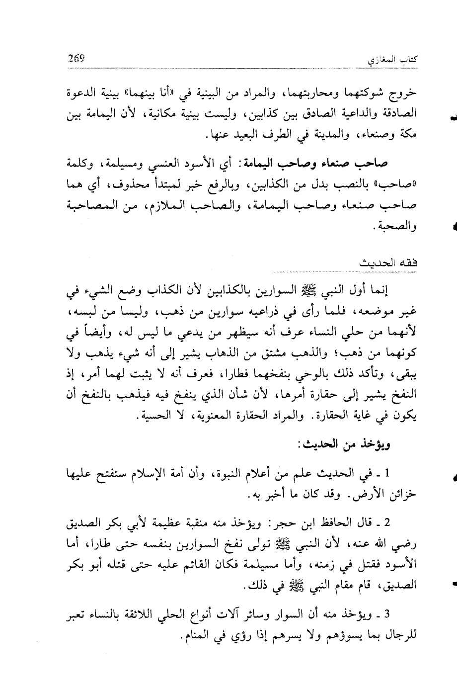 2 - قال الحافظ ابن حجر ويؤخذ منه منقبة عظيمة لأبي بكر الصديق رضي الله عنه لأن النبي صلى الله عليه وسلم تولى نفخ السوارين بنفسه حتى طارا أما الأسود فقتل في زمنه وأما مسيلمة فكان القائم عليه حتى قتله أبو بكر الصديق قام مقام النبي صلى الله عليه وسلم في ذلك