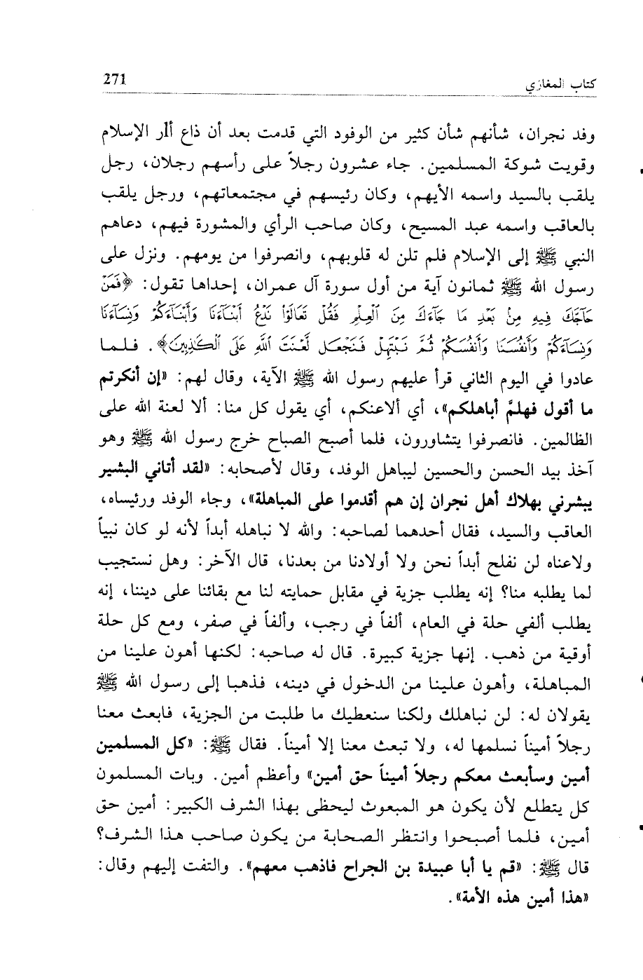 وفد نجران شأنهم شأن كثير من الوفود التي قدمت بعد أن ذاع أمر الإسلام وقويت شوكة المسلمين جاء عشرون رجلا على رأسهم رجلان رجل يلقب بالسيد واسمه الأيهم وكان رئيسهم في مجتمعاتهم ورجل يلقب بالعاقب واسمه عبد المسيح وكان صاحب الرأي والمشورة فيهم دعاهم النبي صلى الله عليه وسلم إلى الإسلام فلم تلن له قلوبهم وانصرفوا من يومهم ونزل على رسول الله صلى الله عليه وسلم ثمانون آية من أول سورة آل عمران إحداها تقول {فمن حاجك فيه من بعد ما جاءك من العلم فقل تعالوا ندع أبناءنا وأبناءكم ونساءنا ونساءكم وأنفسنا وأنفسكم ثم نبتهل فنجعل لعنة الله على الكاذبين} فلما عادوا في اليوم الثاني قرأ عليهم رسول الله صلى الله عليه وسلم الآية وقال لهم إن أنكرتم ما أقول فهلم أباهلكم أي ألاعنكم أي يقول كل منا ألا لعنة الله على الظالمين فانصرفوا يتشاورون فلما أصبح الصباح خرج رسول الله صلى الله عليه وسلم وهو آخذ بيد الحسن والحسين ليباهل الوفد وقال لأصحابه لقد أتاني البشير يبشرني بهلاك أهل نجران إن هم أقدموا على المباهلة وجاء الوفد ورئيساه العاقب والسيد فقال أحدهما لصاحبه والله لا نباهله أبدا لأنه لو كان نبيا ولاعناه لن نفلح أبدا نحن ولا أولادنا من بعدنا قال الآخر وهل نستجيب لما يطلبه منا إنه يطلب جزية في مقابل حمايته لنا مع بقائنا على ديننا إنه يطلب ألفي حلة في العام ألفا في رجب وألفا في صفر ومع كل حلة أوقية من ذهب إنها جزية كبيرة قال له صاحبه لكنها أهون علينا من المباهلة وأهون علينا من الدخول في دينه فذهبا إلى رسول الله صلى الله عليه وسلم يقولان له لن نباهلك ولكنا سنعطيك ما طلبت من الجزية فابعث معنا رجلا أمينا