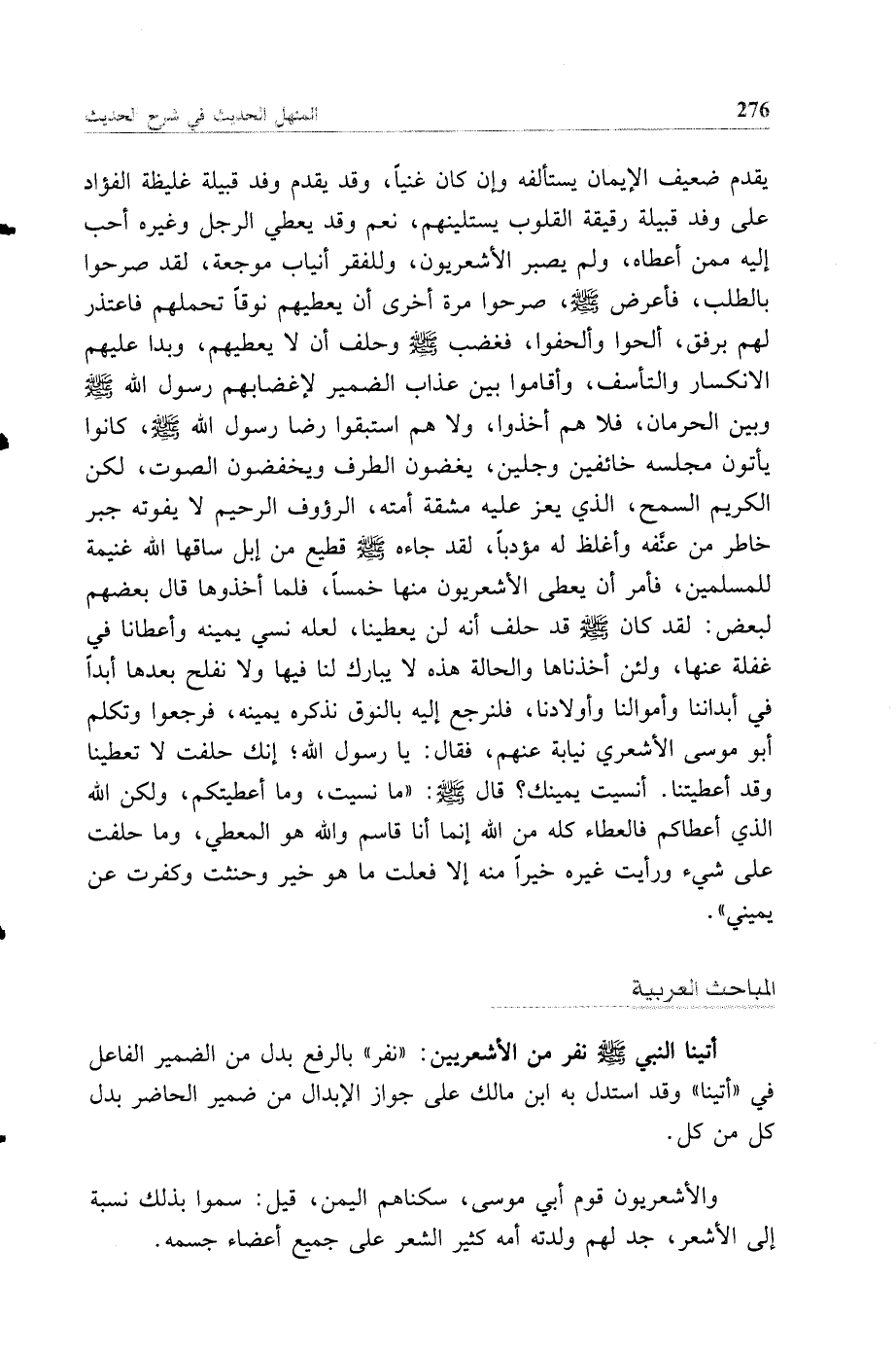 يقدم ضعيف الإيمان يستأنفه وإن كان غنيا وقد يقدم وفد قبيلة غليظة الفؤاد على وفد قبيلة رقيقة القلوب يستلينهم نعم وقد يعطي الرجل وغيره أحب إليه ممن أعطاه ولم يصبر الأشعريون وللفقر أنياب موجعة لقد صرحوا بالطلب فأعرض صلى الله عليه وسلم صرحوا مرة أخرى أن يعطيهم نوقا تحملهم فاعتذر لهم برفق ألحوا وألحفوا فغضب صلى الله عليه وسلم وحلف أن لا يعطيهم وبدا عليهم الانكسار والتأسف وأقاموا بين عذاب الضمير لإغضابهم رسول الله صلى الله عليه وسلم وبين الحرمان فلا هم أخذوا ولا هم استبقوا رضا رسول الله صلى الله عليه وسلم كانوا يأتون مجلسه خائفين وجلين يغضون الطرف ويخفضون الصوت لكن الكريم السمح الذي يعز عليه مشقة أمته الرءوف الرحيم لا يفوته جبر خاطر من عنفه وأغلظ له مؤدبا لقد جاءه صلى الله عليه وسلم قطيع من إبل ساقها الله غنيمة للمسلمين فأمر أن يعطي الأشعريون منها خمسا فلما أخذوها قال بعضهم لبعض لقد كان صلى الله عليه وسلم قد حلف أنه لن يعطينا لعله نسي يمينه وأعطانا في غفلة عنها ولئن أخذناها والحالة هذه لا يبارك لنا فيها ولا نفلح بعدها أبدا في أبداننا وأموالنا وأولادنا فلنرجع إليه بالنوق نذكره يمينه فرجعوا وتكلم أبو موسى الأشعري نيابة عنهم فقال يا رسول الله إنك حلفت لا تعطينا وقد أعطيتنا أنسيت يمينك قال صلى