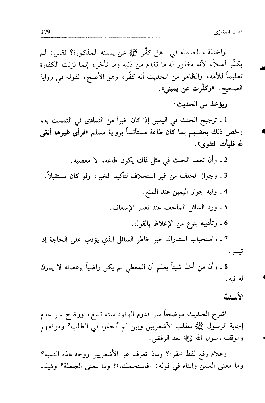 1 - ترجيح الحنث في اليمين إذا كان خيرا من التمادي في التمسك به وخص ذلك بعضهم بما كان طاعة مستأنسا برواية مسلم فرأى غيرها أتقى لله فليأت التقوى