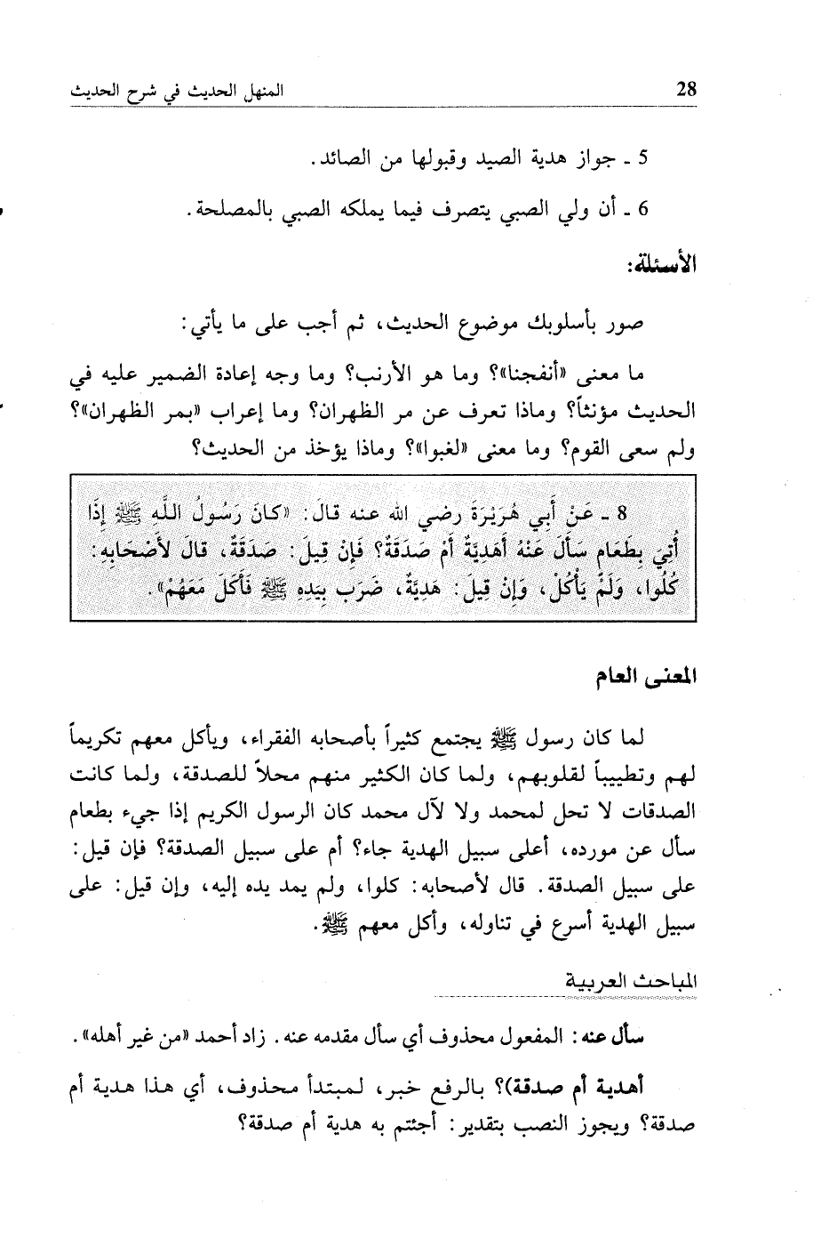 لما كان رسول الله صلى الله عليه وسلم يجتمع كثيرا بأصحابه الفقراء ويأكل معهم تكريما لهم وتطييبا لقلوبهم ولما كان الكثير منهم محلا للصدقة ولما كانت الصدقات لا تحل لمحمد ولا لآل محمد كان الرسول الكريم إذا جيء بطعام سأل عن مورده أعلى سبيل الهدية جاء؟ أم على سبيل الصدقة فإن قيل على سبيل الصدقة قال لأصحابه: كلوا ولم يمد يده إليه وإن قيل على سبيل الهدية أسرع في تناوله وأكل معهم صلى الله عليه وسلم