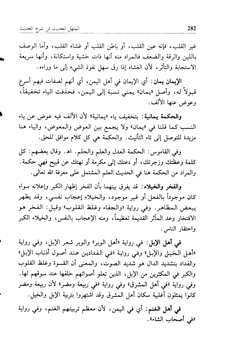 (في أهل الإبل) في رواية أهل الوبر والوبر شعر الإبل وفي رواية أهل الخيل والإبل وفي رواية في الفدادين عند أصول أذناب الإبل والفداد بتشديد الدال هو شديد الصوت والمعنى أن القسوة وغلظ القلوب والكبر في المكثرين من الإبل الذين تعلو أصواتهم خلفها عند سوقهم لها وفي رواية في أهل المشرق وفي رواية في ربيعة ومضر لأن ربيعة ومضر كانوا يمثلون أغلبية سكان أهل المشرق وقد اشتهروا بتربية الإبل والخيل