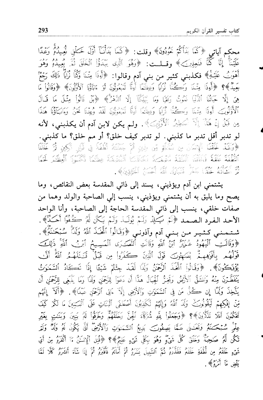 محكم آياتي {كما بدأكم تعودون} وقلت {كما بدأنا أول خلق نعيده وعدا علينا إنا كنا فاعلين} وقلت {وهو الذي يبدأ الخلق ثم يعيده وهو أهون عليه} فكذبني كثير من بني آدم وقالوا {أئذا متنا وكنا ترابا ذلك رجع بعيد} {أئذا متنا وكنا ترابا وعظاما أئنا لمبعوثون أو آباؤنا الأولون} {وقالوا ما هي إلا حياتنا الدنيا نموت ونحيا وما يهلكنا إلا الدهر} {بل قالوا مثل ما قال الأولون أئذا متنا وكنا ترابا وعظاما أئنا لمبعوثون لقد وعدنا نحن وآباؤنا هذا من قبل إن هذا إلا أساطير الأولين} ولم يكن لابن آدم أن يكذبني لأنه لو تدبر أقل تدبر ما كذبني لو تدبر كيف خلق أو مم خلق ما كذبني {ولقد خلقنا الإنسان من سلالة من طين ثم جعلناه نطفة في قرار مكين ثم خلقنا النطفة علقة فخلقنا العلقة مضغة فخلقنا المضغة عظاما فكسونا العظام لحما ثم أنشأناه خلقا آخر فتبارك الله أحسن الخالقين}