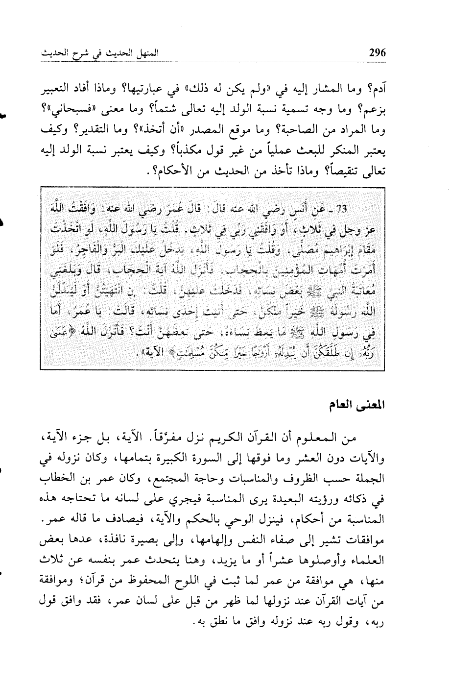 73 - عن أنس رضي الله عنه قال: قال عمر رضي الله عنه وافقت الله عز وجل في ثلاث أو وافقني ربي في ثلاث قلت يا رسول الله لو اتخذت مقام إبراهيم مصلى وقلت يا رسول الله يدخل عليك البر والفاجر فلو أمرت أمهات المؤمنين بالحجاب فأنزل الله آية الحجاب قال وبلغني معاتبة النبي صلى الله عليه وسلم بعض نسائه فدخلت عليهن قلت إن انتهيتن أو ليبدلن الله رسوله صلى الله عليه وسلم خيرا منكن حتى أتيت إحدى نسائه قالت: يا عمر أما في رسول الله صلى الله عليه وسلم ما يعظ نساءه حتى تعظهن أنت فأنزل الله {عسى ربه إن طلقكن أن يبدله أزواجا خيرا منكن مسلمات} الآية