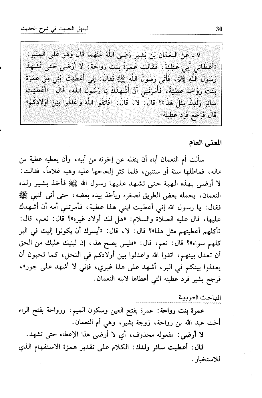 9 - عن النعمان بن بشير رضي الله عنهما قال وهو على المنبر: أعطاني أبي عطية فقالت عمرة بنت رواحة: لا أرضى حتى تشهد رسول الله صلى الله عليه وسلم فأتى رسول الله صلى الله عليه وسلم فقال إني أعطيت ابني من عمرة بنت رواحة عطية فأمرتني أن أشهدك يا رسول الله قال أعطيت سائر ولدك مثل هذا قال لا قال فاتقوا الله واعدلوا بين أولادكم قال فرجع فرد عطيته