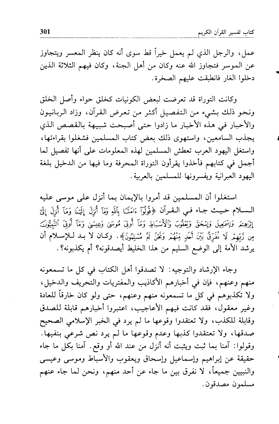 وجاء الإرشاد والتوجيه لا تصدقوا أهل الكتاب في كل ما تسمعونه منهم وعنهم فإن في أخبارهم الأكاذيب والمفتريات والتحريف والدخيل ولا تكذبوهم في كل ما تسمعونه منهم وعنهم حتى ولو كان خارقا للعادة وغير معقول فقد كانت فيهم الأعاجيب اعتبروا أخبارهم قابلة للصدق وقابلة للكذب ولا تعتقدوا وقوعها ما لم يرد في الخبر الإسلامي الصحيح صدقها ولا تعتقدوا كذبها وعدم وقوعها ما لم يرد نص شرعي بنفيها وقولوا آمنا بما ثبت ويثبت أنه أنزل من عند الله أو وقع آمنا بكل ما جاء حقيقة عن إبراهيم وإسماعيل وإسحق ويعقوب والأسباط وموسى وعيسى والنبيين جميعا لا نفرق بين ما جاء عن أحد منهم ونحن لما جاء عنهم مسلمون مصدقون