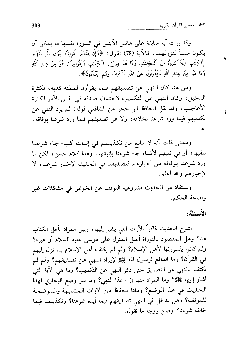 ومن هنا كان النهي عن تصديقهم فيما يقرءون لمظنة كذبة لكثرة الدخيل وكان النهي عن التكذيب لاحتمال صدقة في نفس الأمر لكثرة الأعاجيب وقد نقل الحافظ ابن حجر عن الشافعي قوله لم يرد النهي عن تكذيبهم فيما ورد شرعنا بخلافه ولا عن تصديقهم فيما ورد شرعنا بوفاقه أهـ