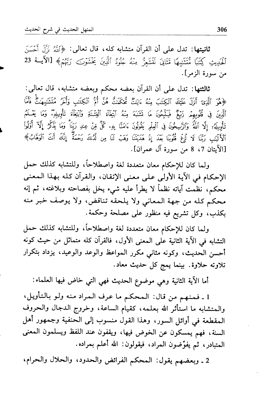 1 - فمنهم من قال: المحكم ما عرف المراد منه ولو بالتأويل والمتشابه ما استأثر الله بعلمه كقيام الساعة وخروج الدجال والحروف المقطعة في أوائل السور وهذا القول منسوب إلى الحنفية وجمهور أهل السنة فهم يمسكون عن الخوض فيها ويقفون عند اللفظ ويسلمون المعنى المتبادر ثم يفوضون المراد فيقولون الله أعلم بمراده