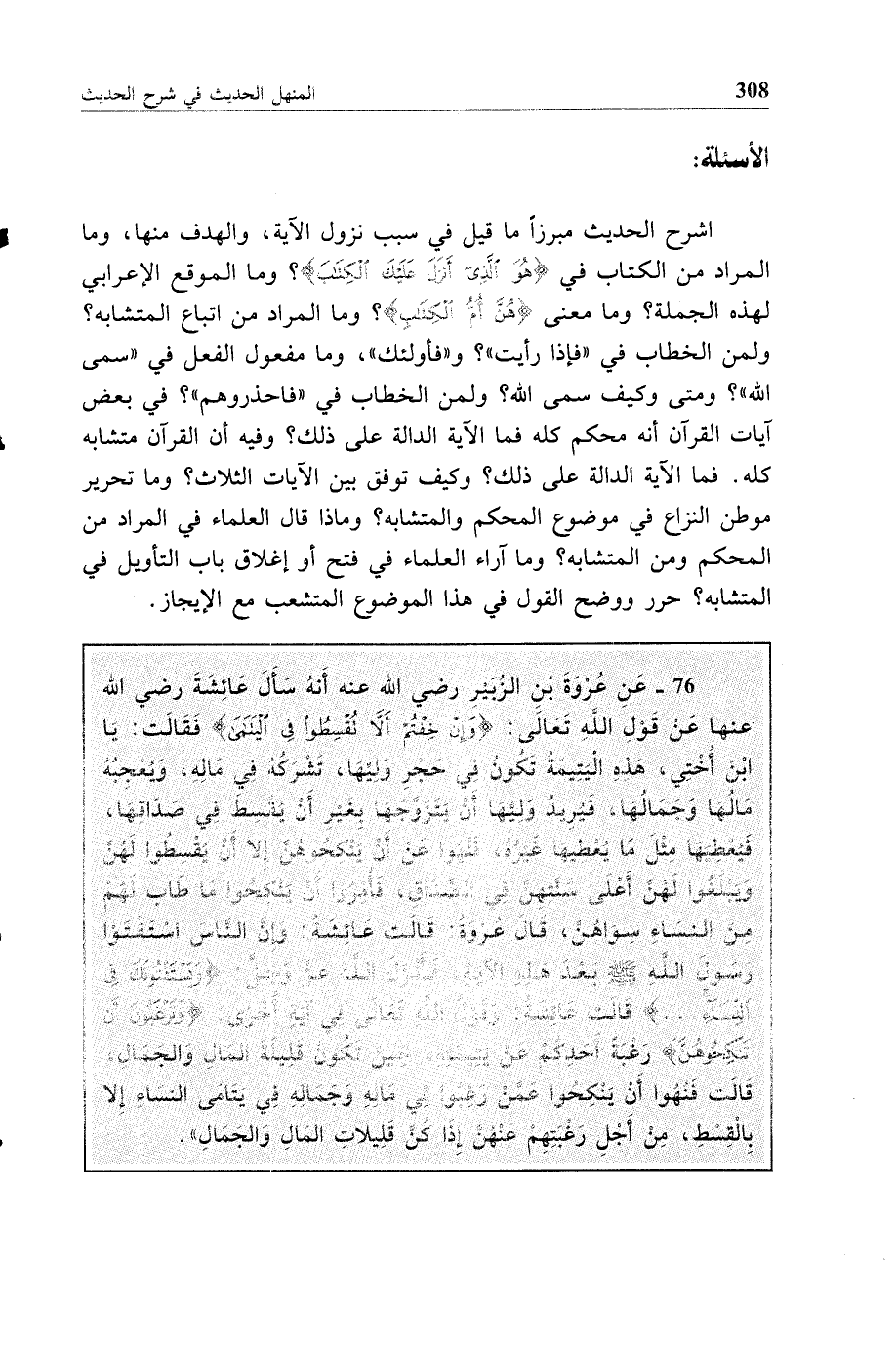 76 - عن عروة بن الزبير رضي الله عنه أنه سأل عائشة رضي الله عنها عن قول الله تعالى {وإن خفتم أن لا تقسطوا في اليتامى} فقالت يا ابن أختي هذه اليتيمة تكون في حجر وليها تشركه في ماله ويعجبه مالها وجمالها فيريد وليها أن يتزوجها بغير أن يقسط في صداقها فيعطيها مثل ما يعطيها غيره فنهوا عن أن ينكحوهن إلا أن يقسطوا لهن ويبلغوا لهن أعلى سنتهن في الصداق فأمروا أن ينكحوا ما طاب لهم من النساء سواهن قال عروة قالت عائشة وإن الناس استفتوا رسول الله صلى الله عليه وسلم بعد هذه الآية فأنزل الله عز وجل: {ويستفتونك في النساء ... } قالت عائشة وقول الله تعالى في آية أخرى {وترغبون أن تنكحوهن} رغبة أحدكم عن يتيمته حين تكون قليلة المال والجمال قالت فنهوا أن ينكحوا عمن رغبوا في ماله وجماله في يتامى النساء إلا بالقسط من أجل رغبتهم عنهن إذا كن قليلات المال والجمال